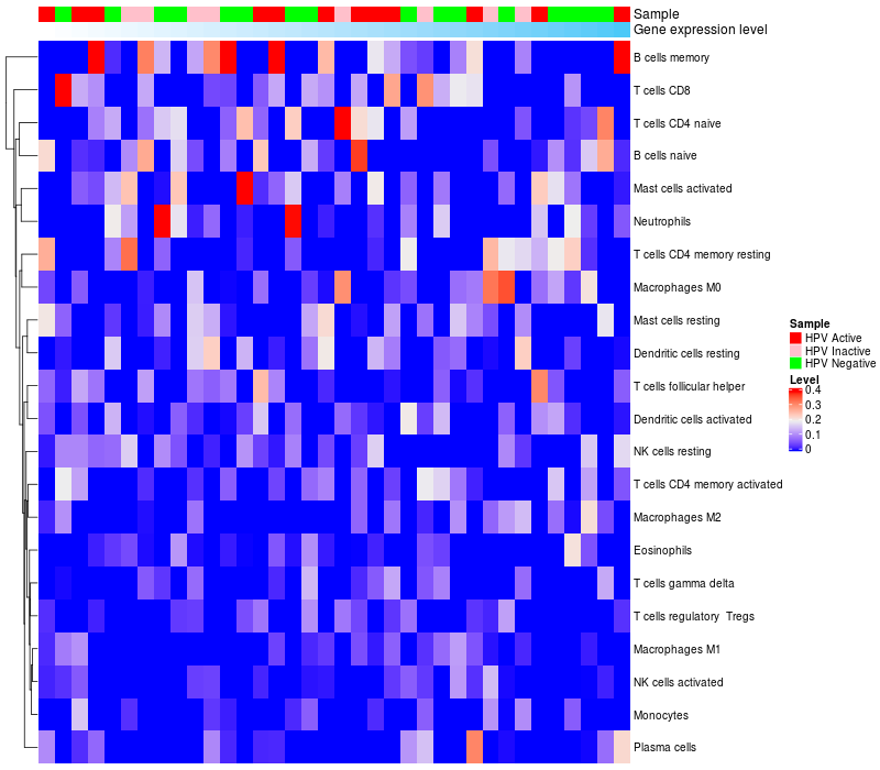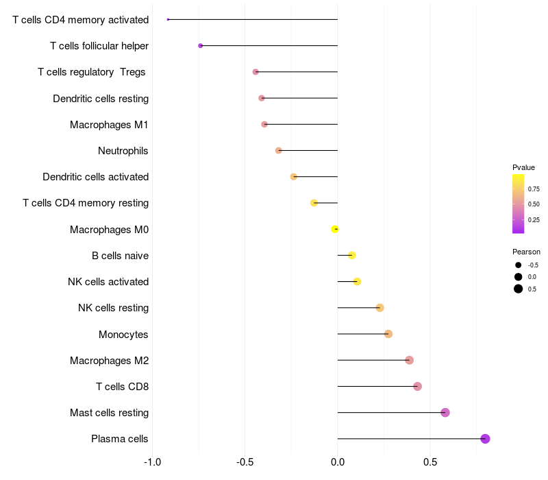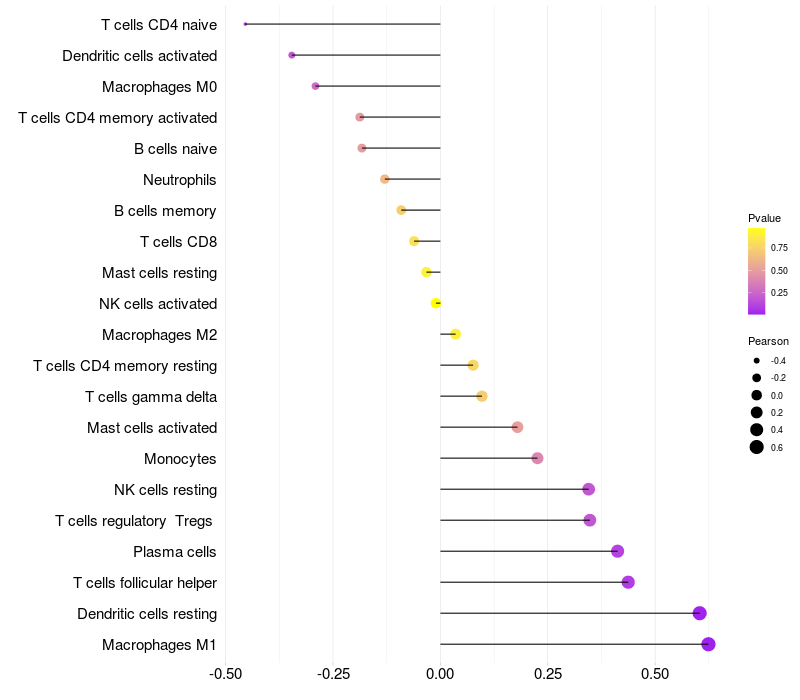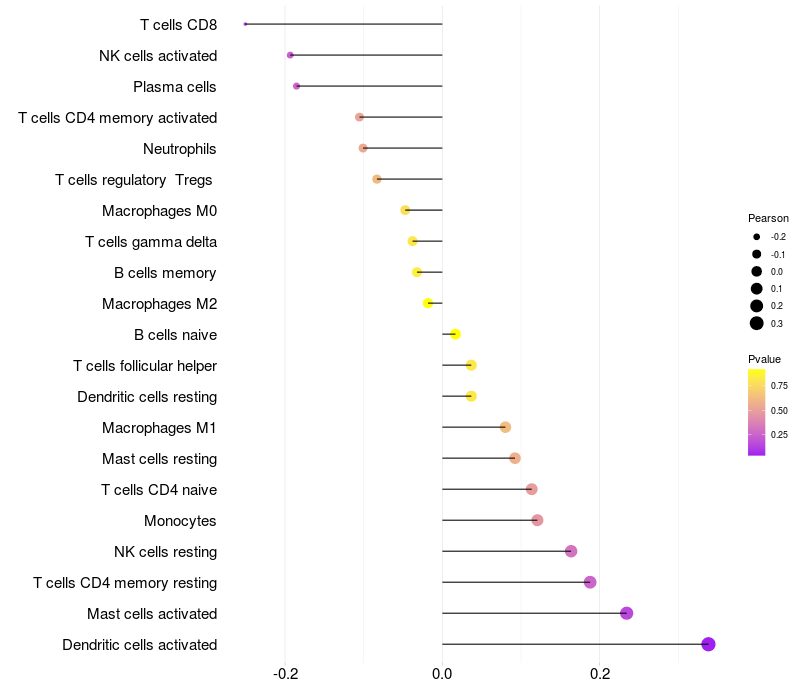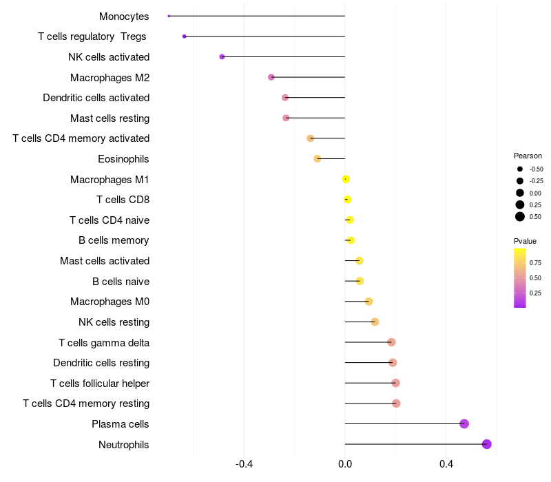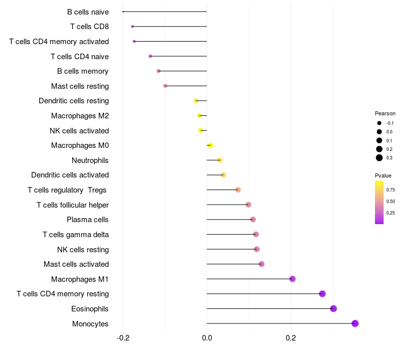 Lollipop of INTU expression and immune infiltrating cell level correlation result in HPV+ samples