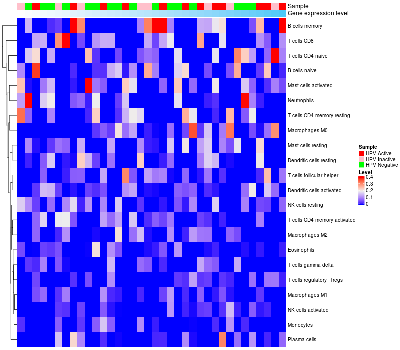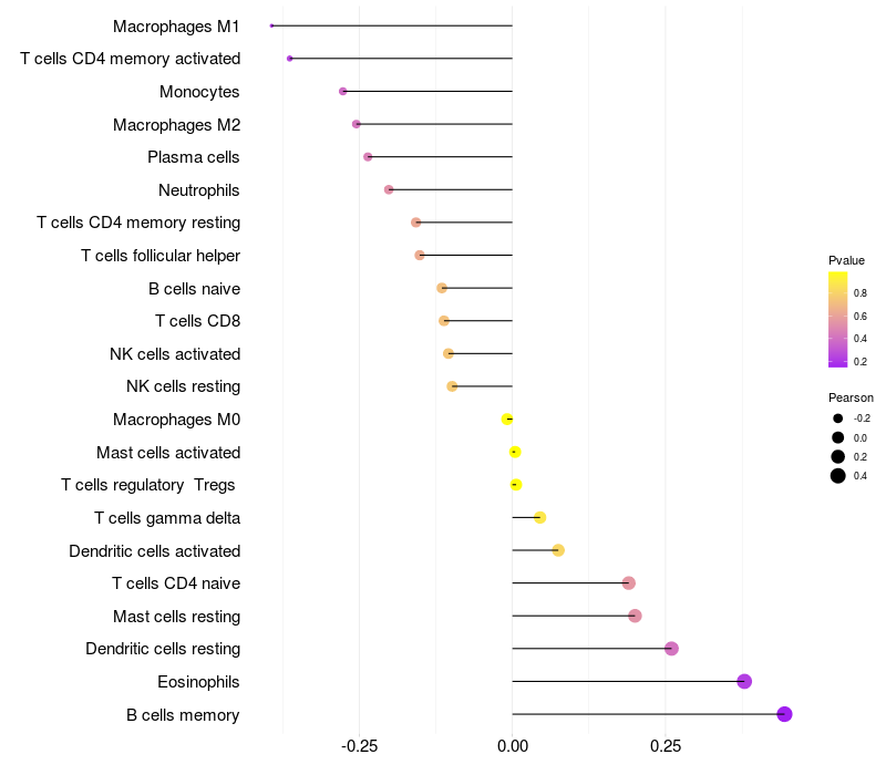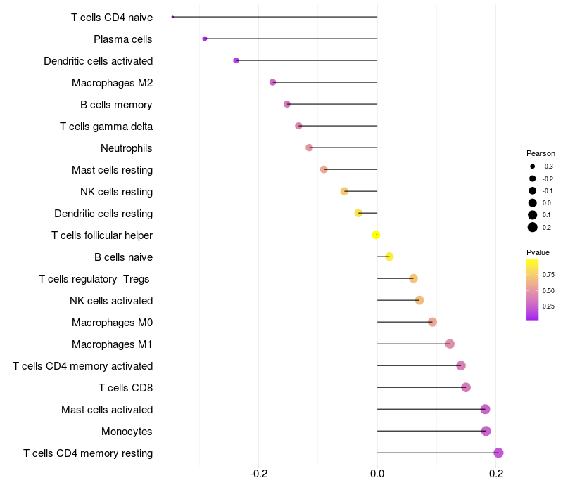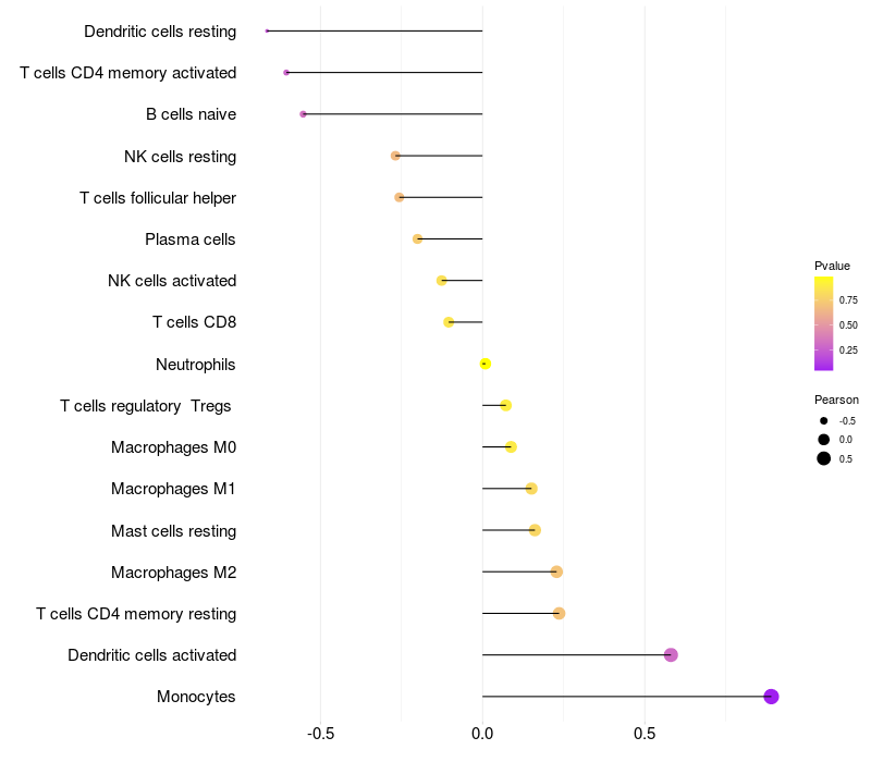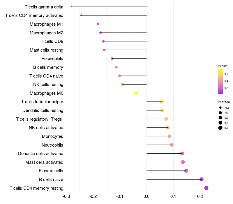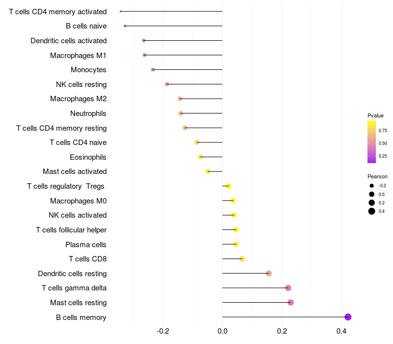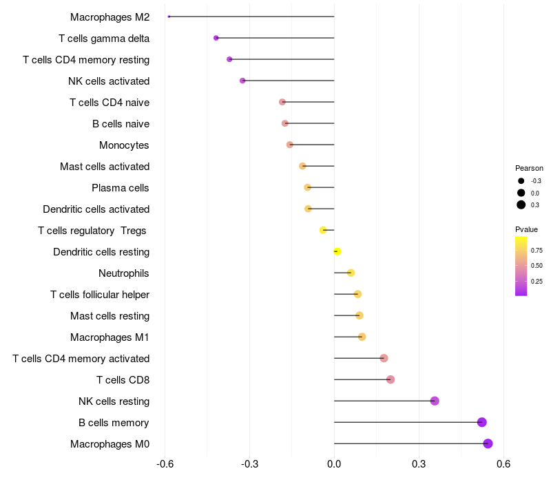 Lollipop of IRF2BP2 expression and immune infiltrating cell level correlation result in HPV+ samples