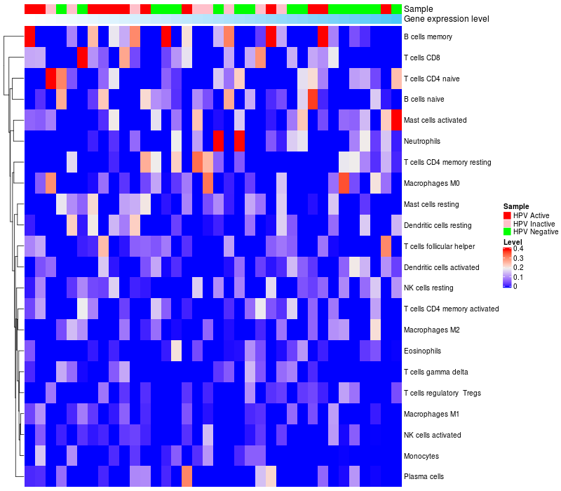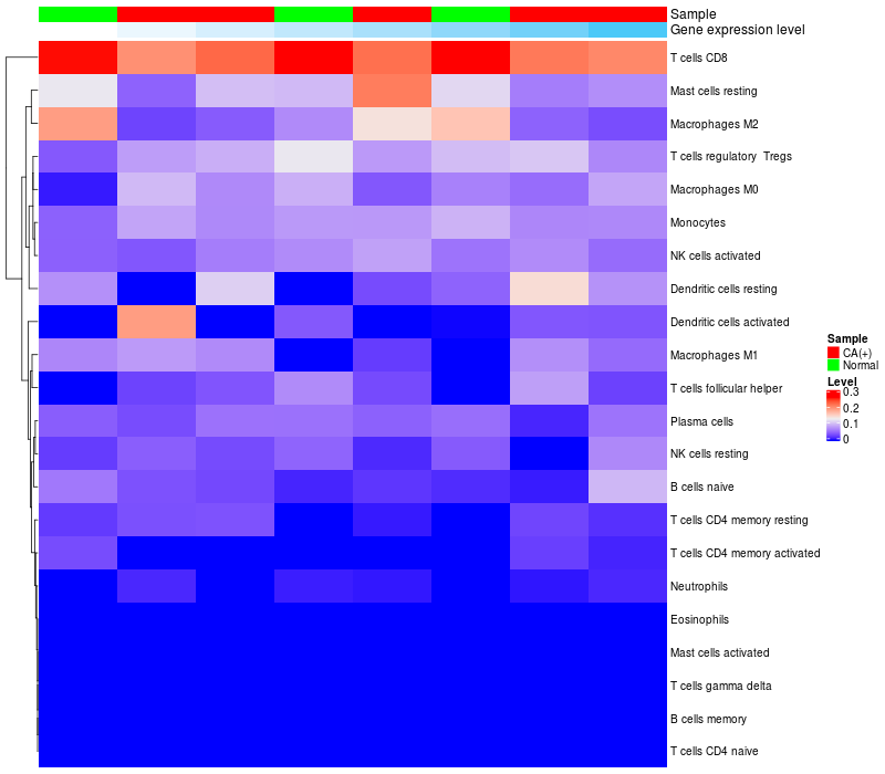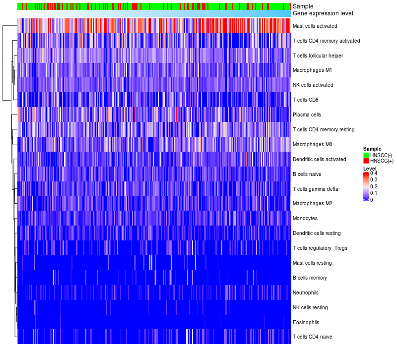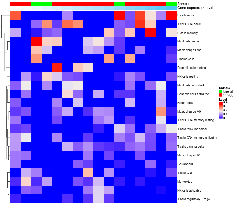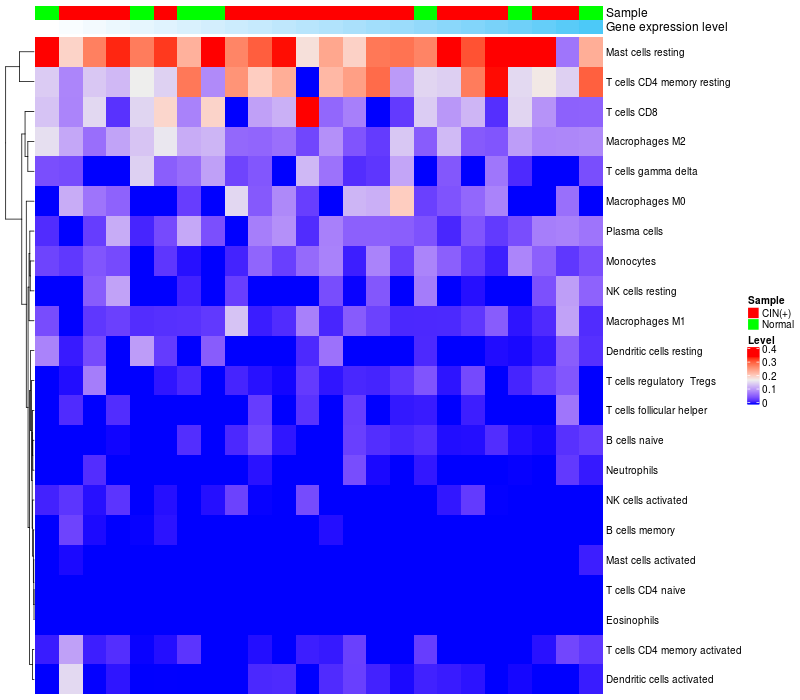 • Left: Heatmap of target gene expression and the level of various types of immune cells (cell type fractions) in all samples based on CIBERSORT method.