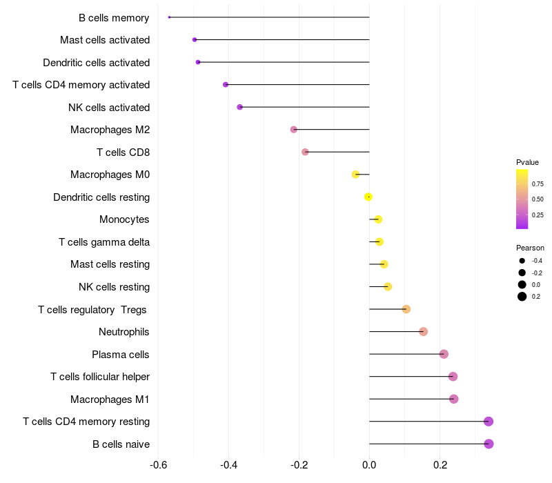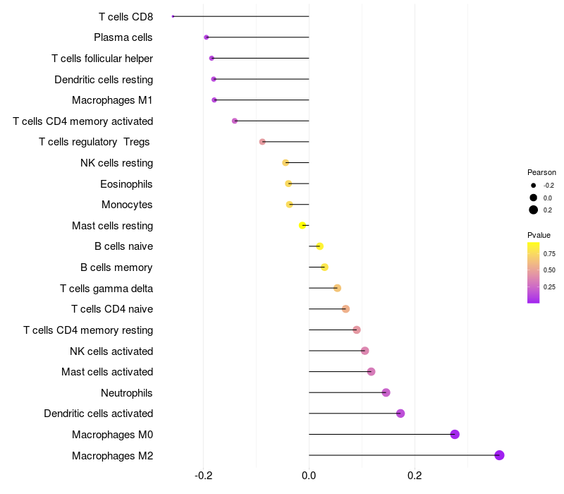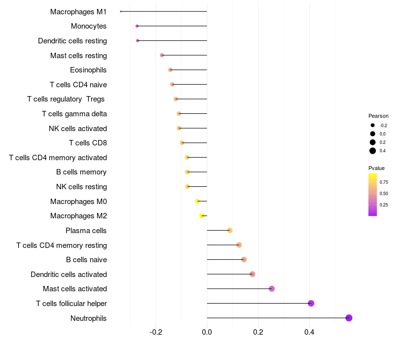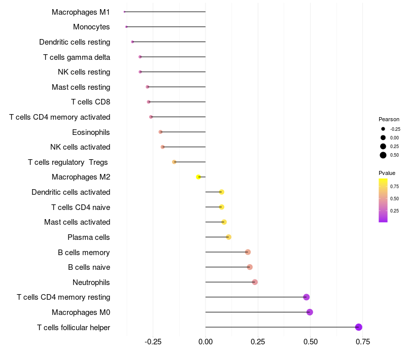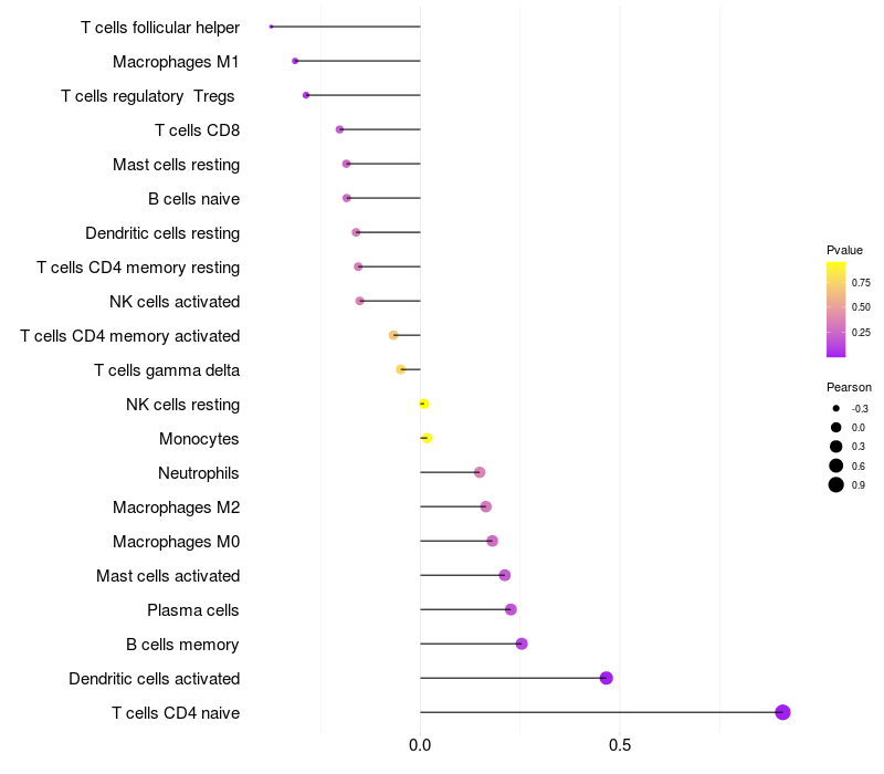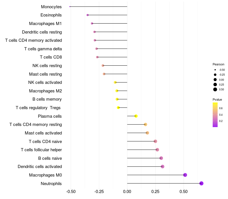 • Right: Correlation of target gene expression and the level of various types of immune cells in virus positive samples (Pearson Correlation Coefficient).