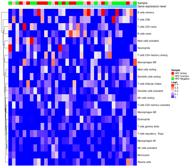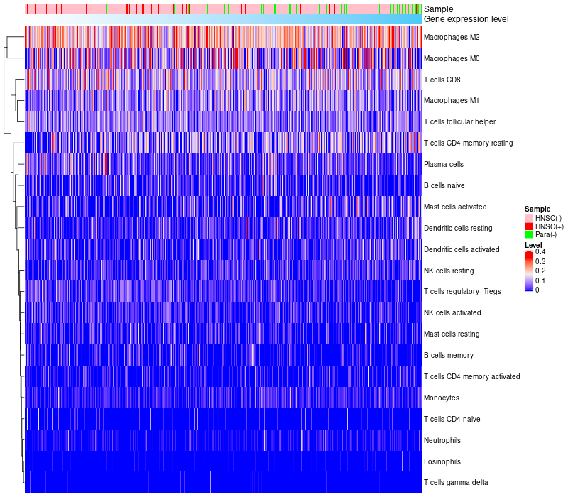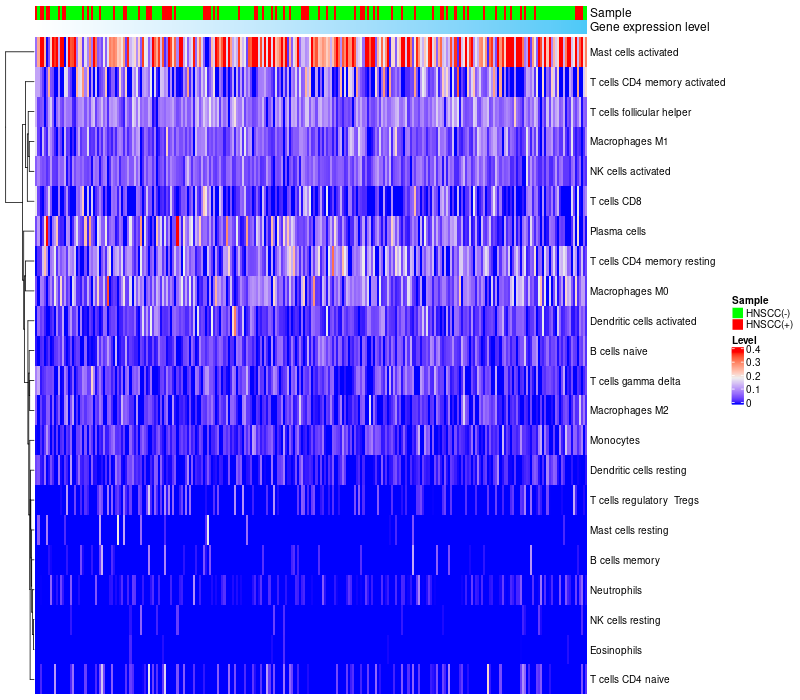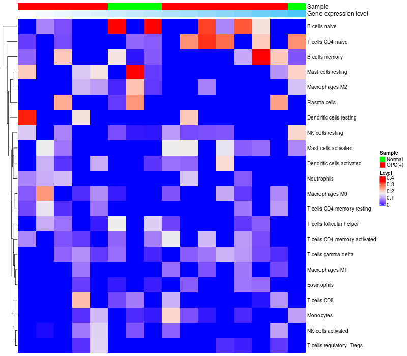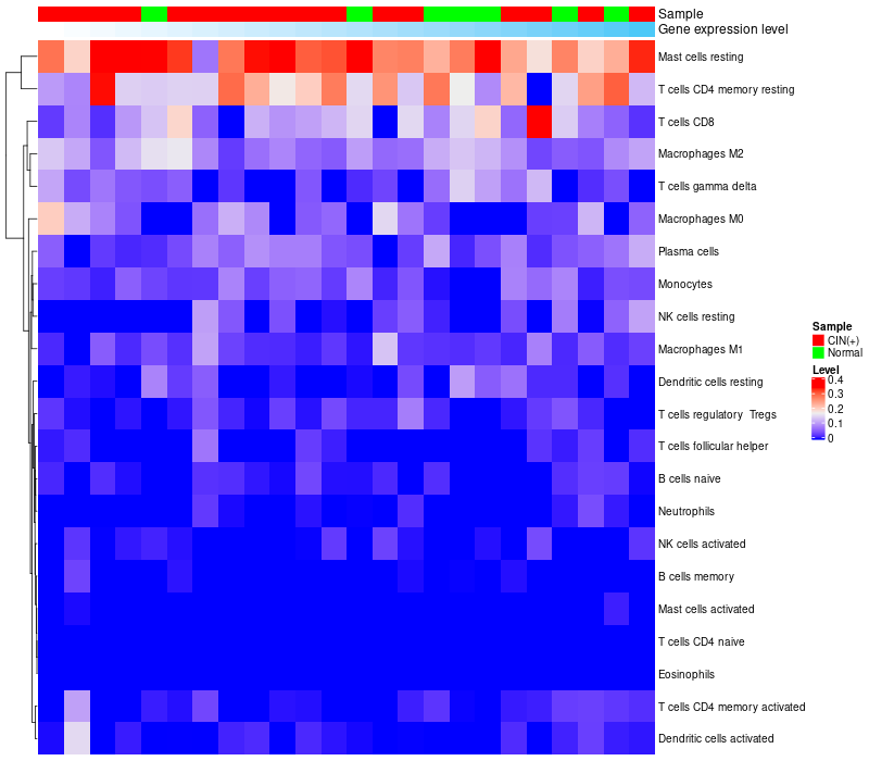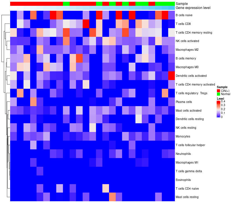 • Left: Heatmap of target gene expression and the level of various types of immune cells (cell type fractions) in all samples based on CIBERSORT method.