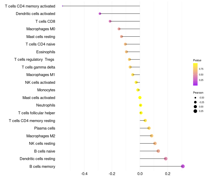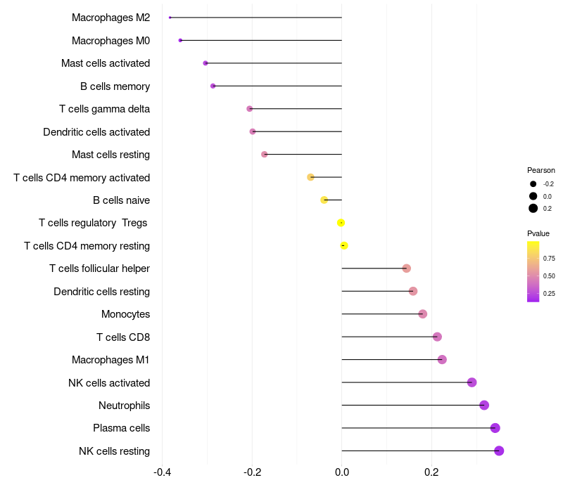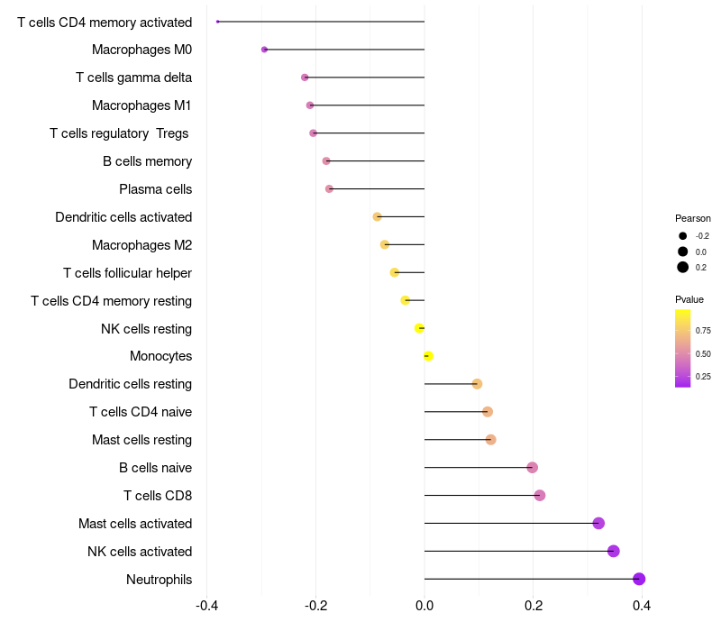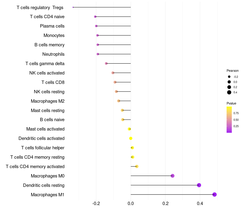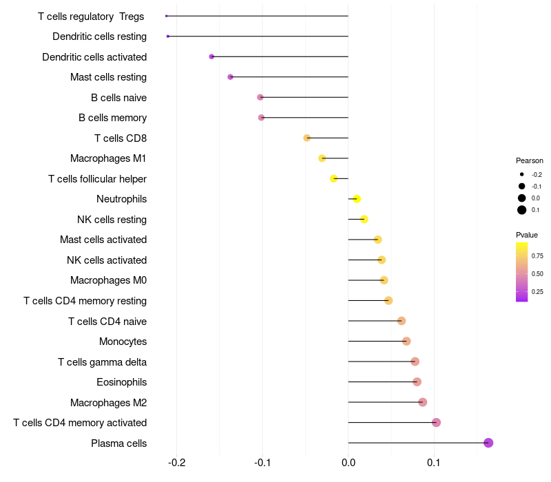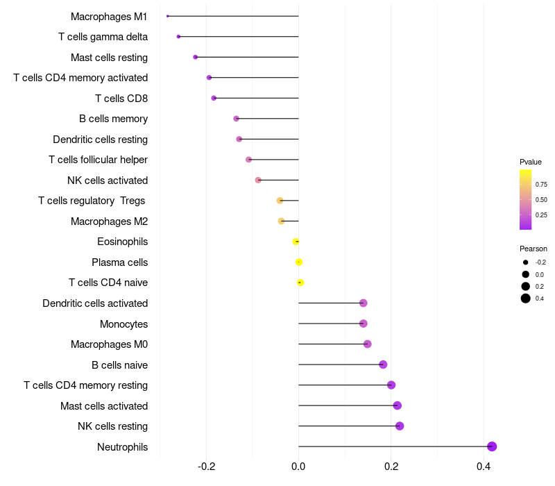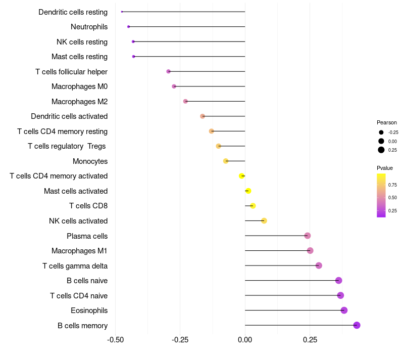 • Right: Correlation of target gene expression and the level of various types of immune cells in virus positive samples (Pearson Correlation Coefficient).