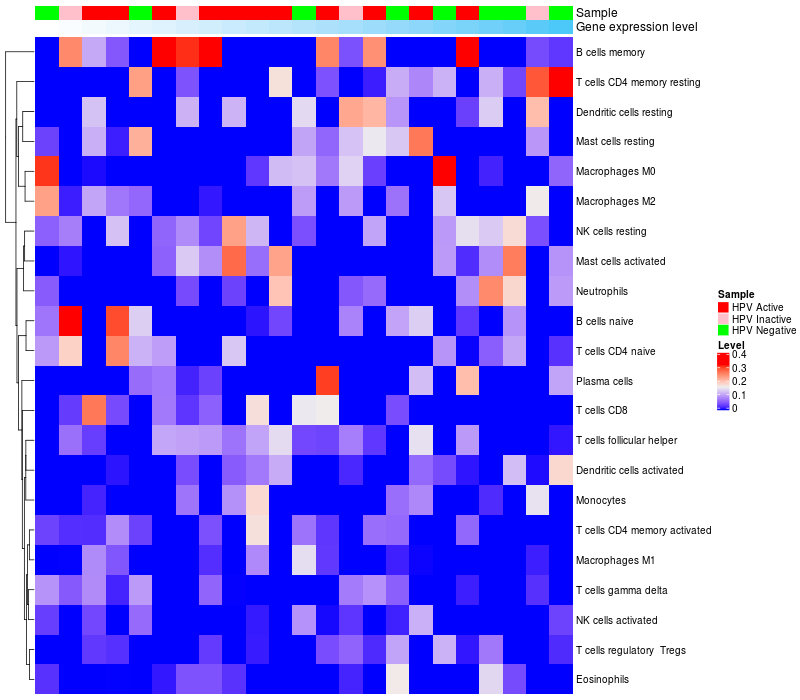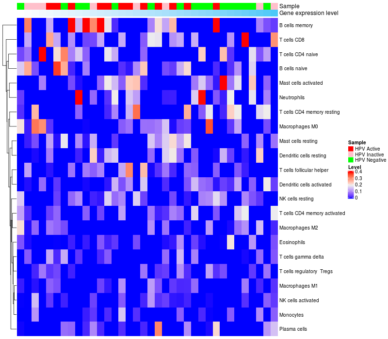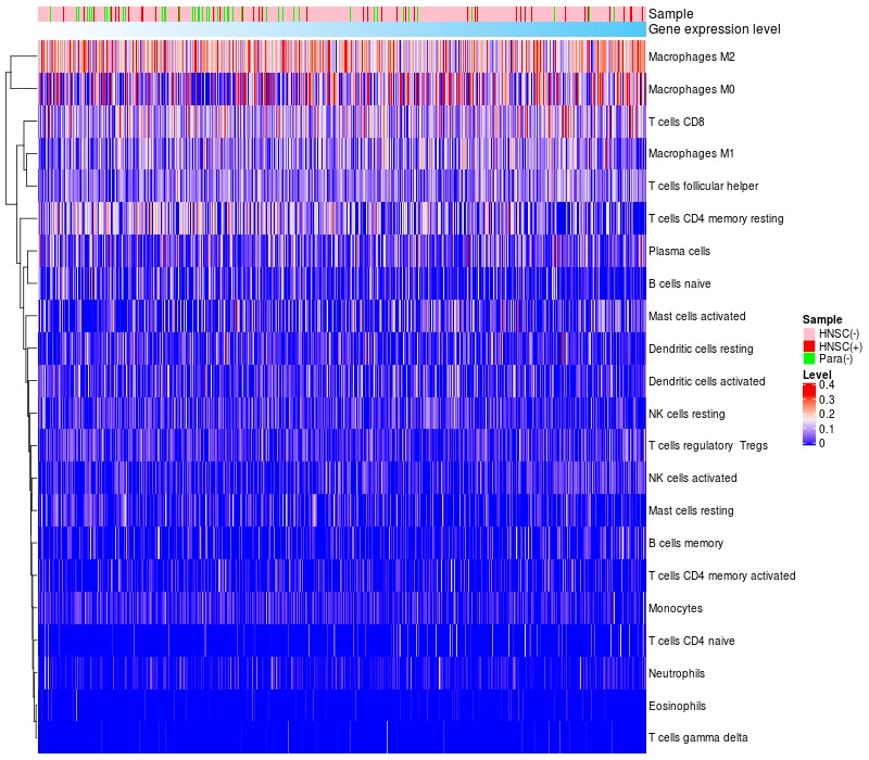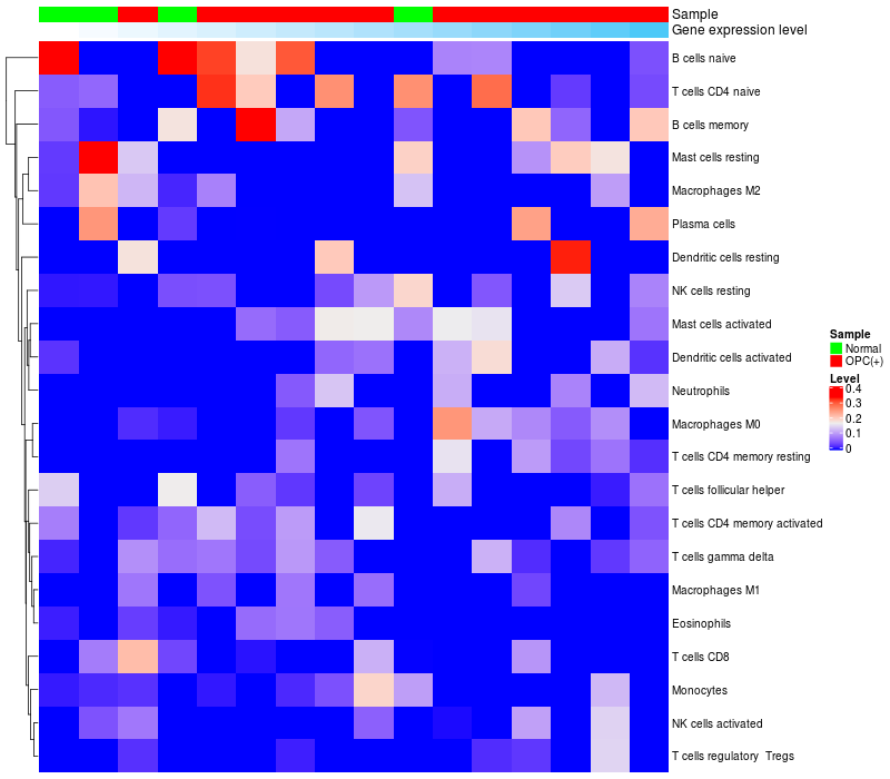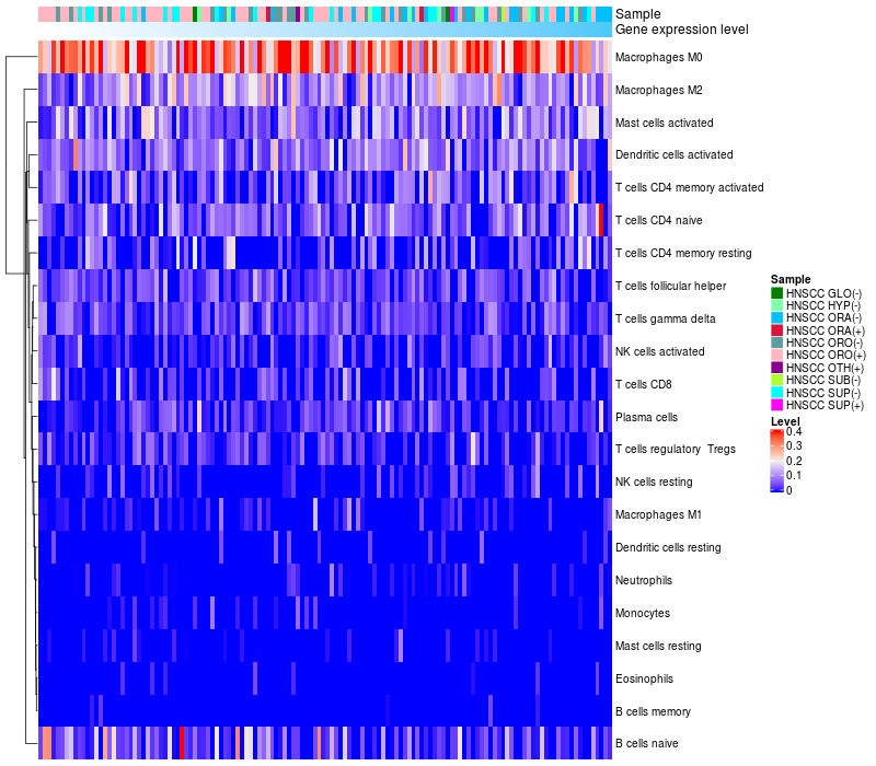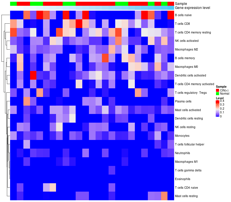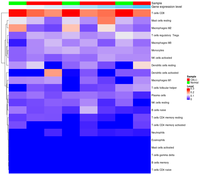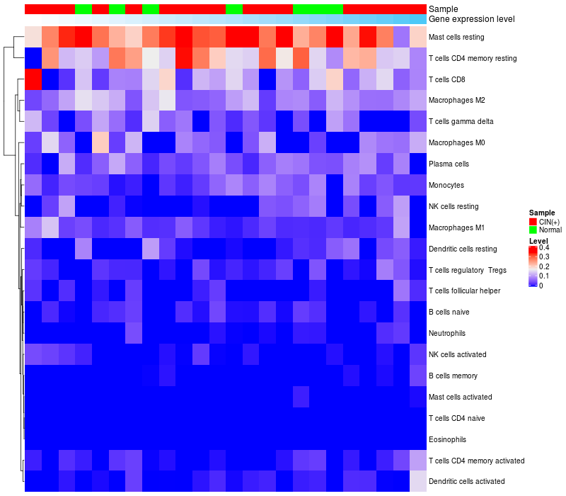 • Left: Heatmap of target gene expression and the level of various types of immune cells (cell type fractions) in all samples based on CIBERSORT method.