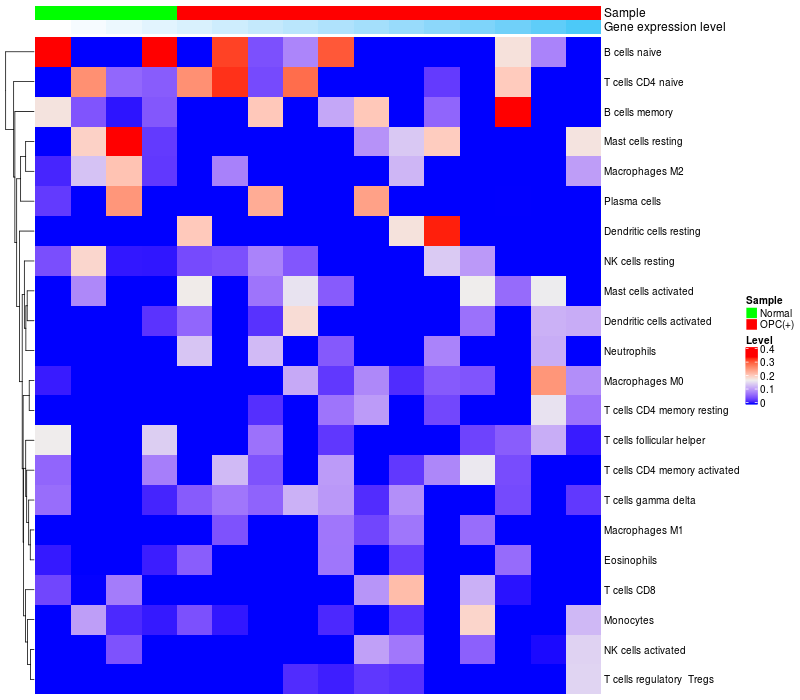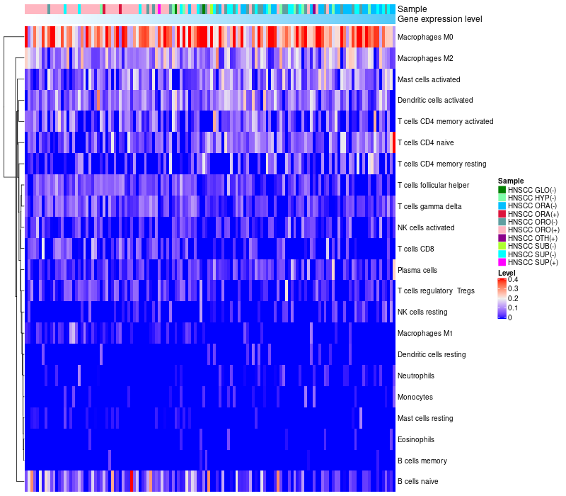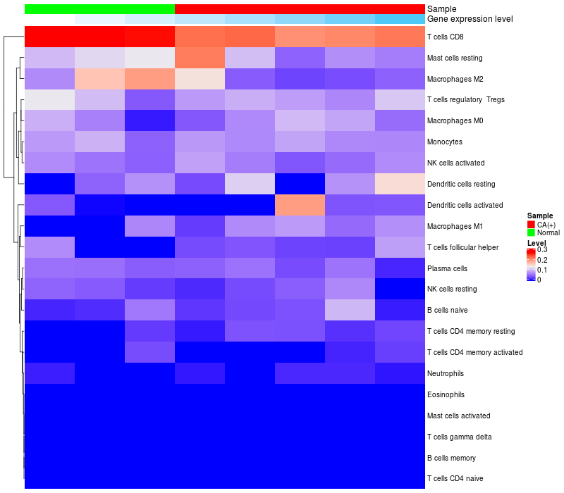 • Left: Heatmap of target gene expression and the level of various types of immune cells (cell type fractions) in all samples based on CIBERSORT method.