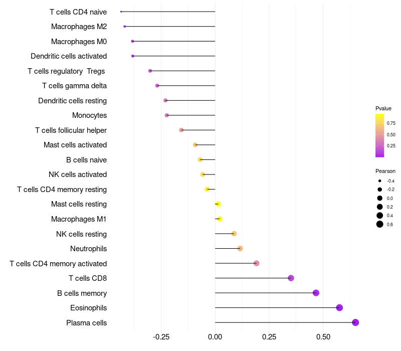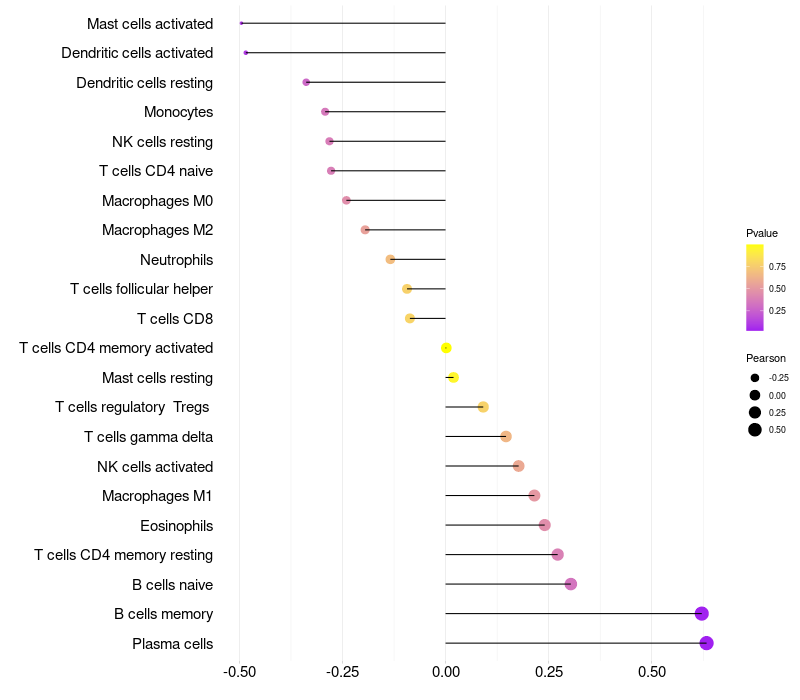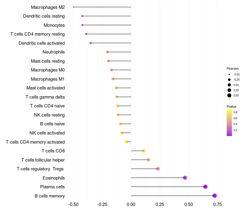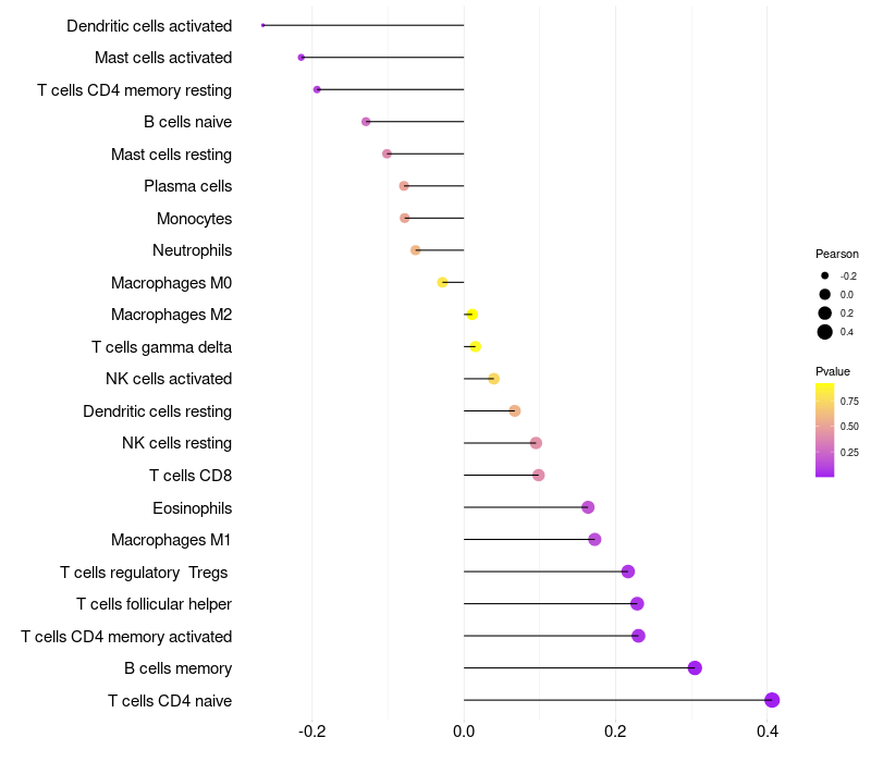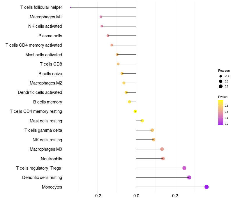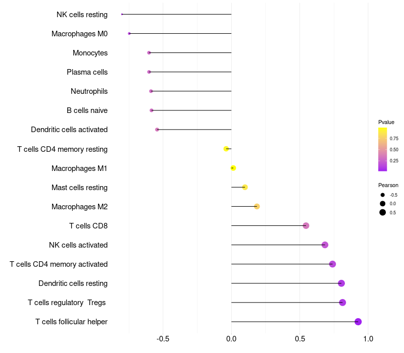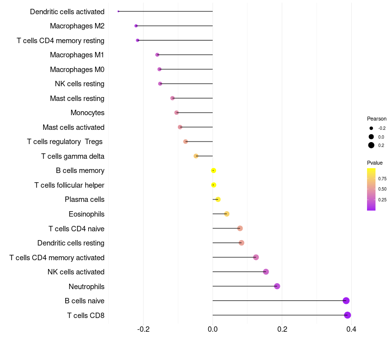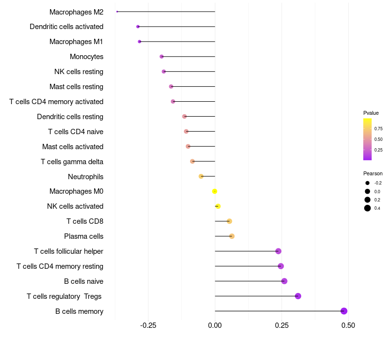 Lollipop of KRT73 expression and immune infiltrating cell level correlation result in HPV+ samples