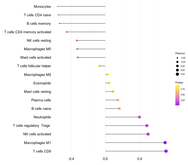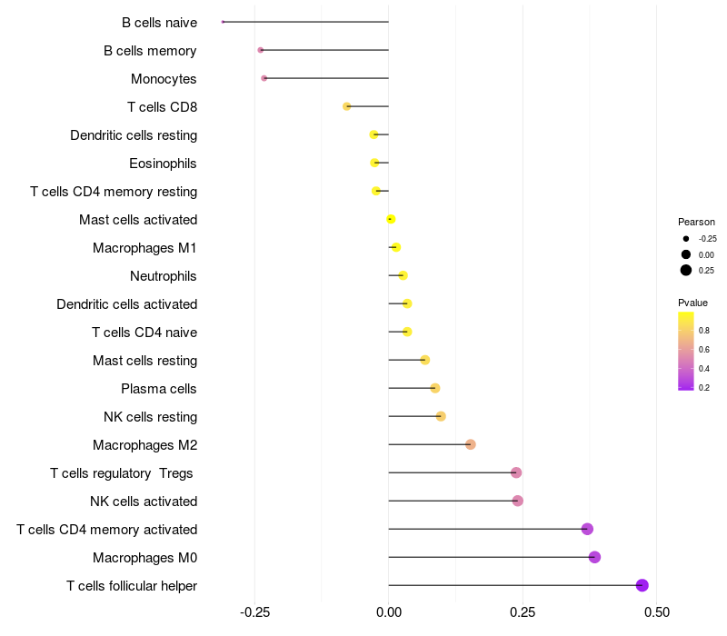 Lollipop of LMLN expression and immune infiltrating cell level correlation result in HBV+ Liver cirrhosis samples