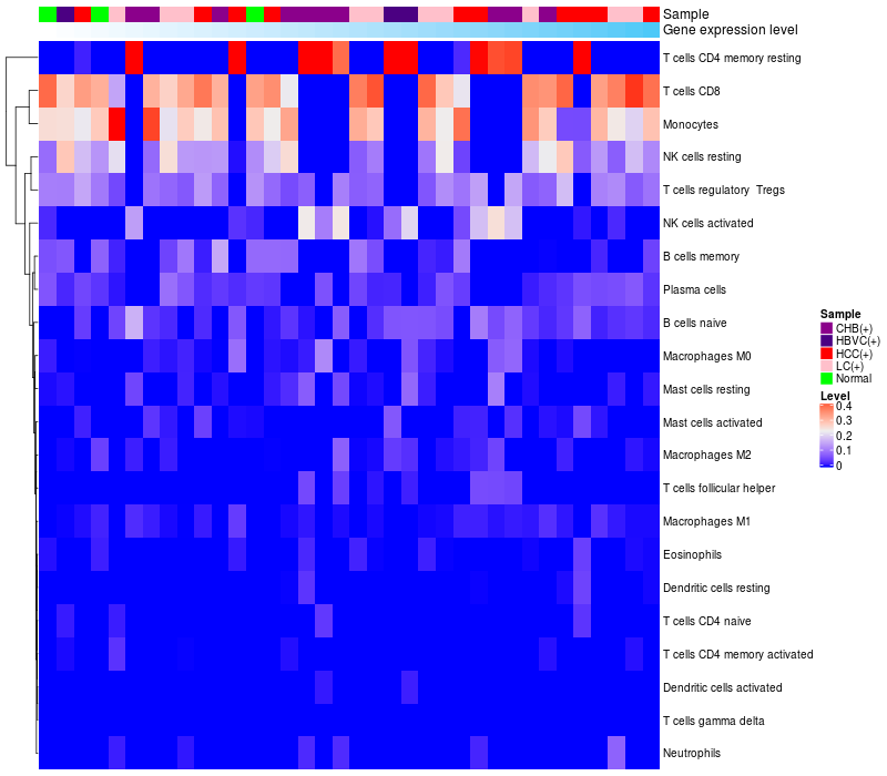 Chronic hepatitis B patients (HBV+)(10),Hepatocellular carcinoma (HBV+)(10),Liver cirrhosis(HBV+)(10),Normal(3),HBV carriers (3) |