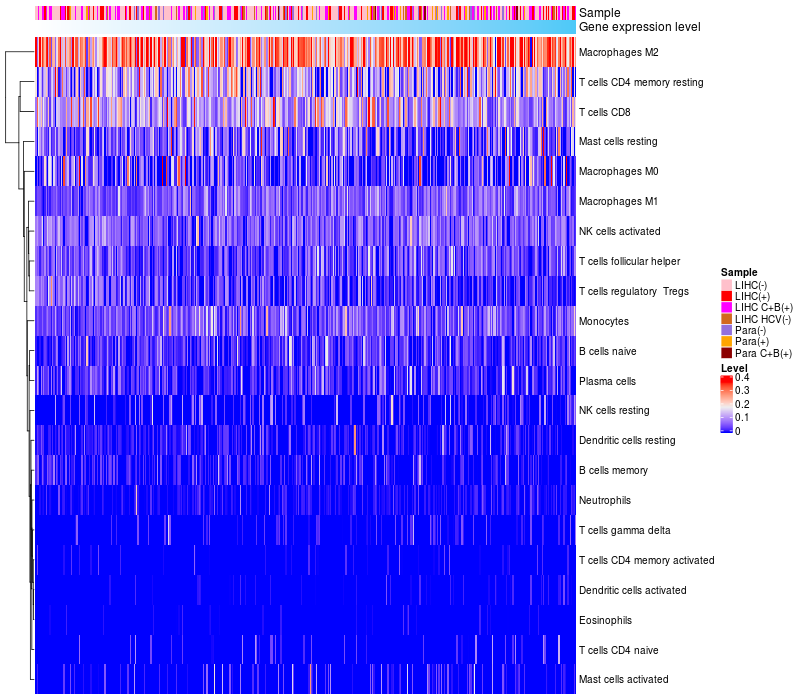 Liver hepatocellular carcinoma HCV (HBV+)(86), Liver hepatocellular carcinoma HCV (HBV-)(19), Liver hepatocellular carcinoma (HBV+)(209), Liver hepatocellular carcinoma (HBV+)(60), Paracancerous HCV (HBV+)(4), Paracancerous (HBV-)(28), Paracancerous (HBV+)(18) |