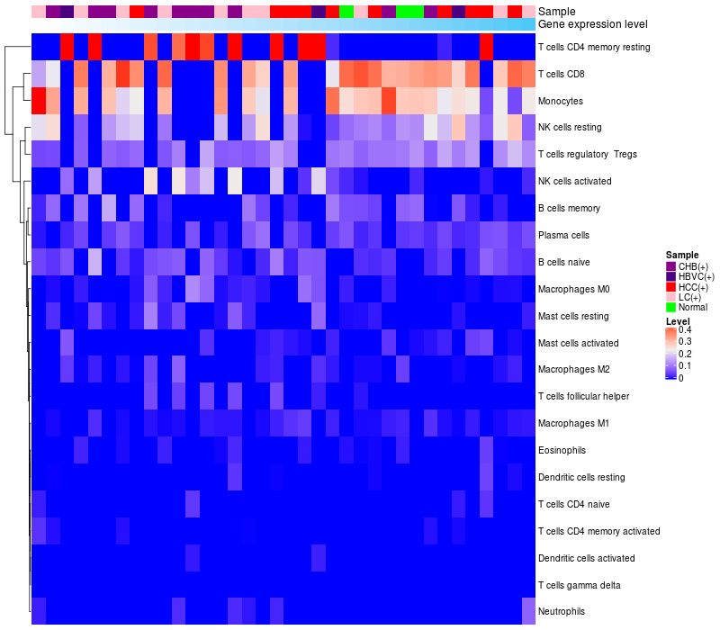 Chronic hepatitis B patients (HBV+)(10),Hepatocellular carcinoma (HBV+)(10),Liver cirrhosis(HBV+)(10),Normal(3),HBV carriers (3) |