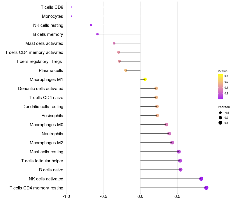 Lollipop of LRRC20 expression and immune infiltrating cell level correlation result in HBV+ Chronic HBV (CHB) infection samples