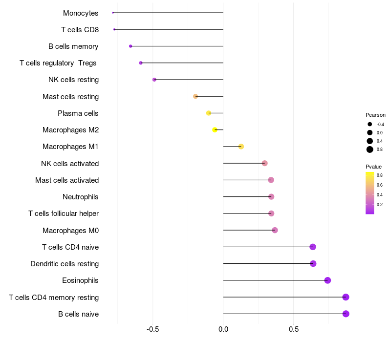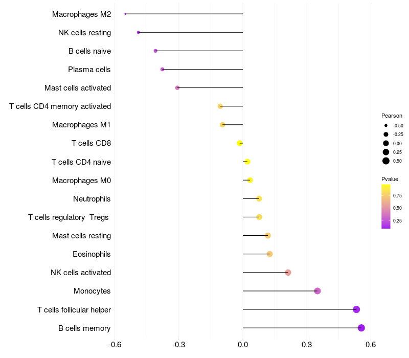Lollipop of LRRC20 expression and immune infiltrating cell level correlation result in HBV+ Hepatocellular carcinoma samples