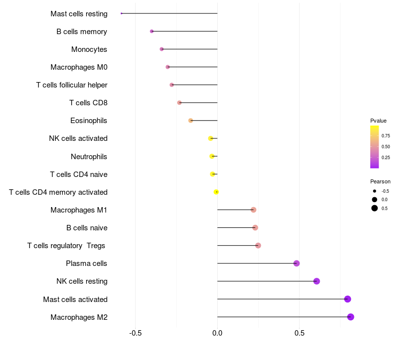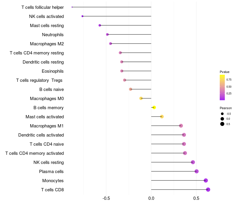Lollipop of LYNX1 expression and immune infiltrating cell level correlation result in HBV+ Liver cirrhosis samples