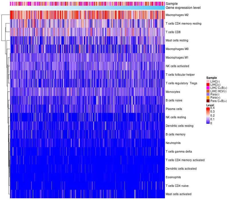 Liver hepatocellular carcinoma HCV (HBV+)(86), Liver hepatocellular carcinoma HCV (HBV-)(19), Liver hepatocellular carcinoma (HBV+)(209), Liver hepatocellular carcinoma (HBV+)(60), Paracancerous HCV (HBV+)(4), Paracancerous (HBV-)(28), Paracancerous (HBV+)(18) |