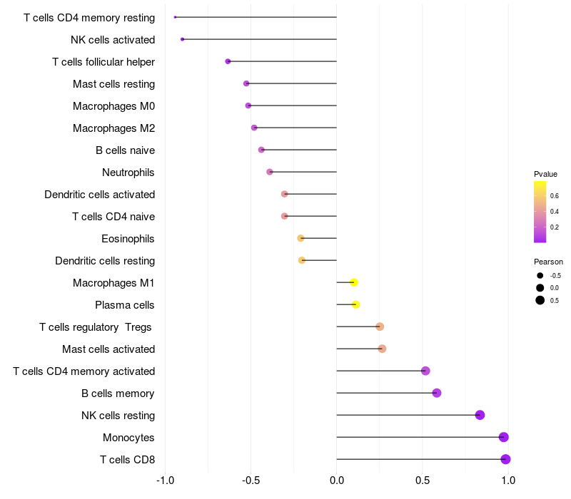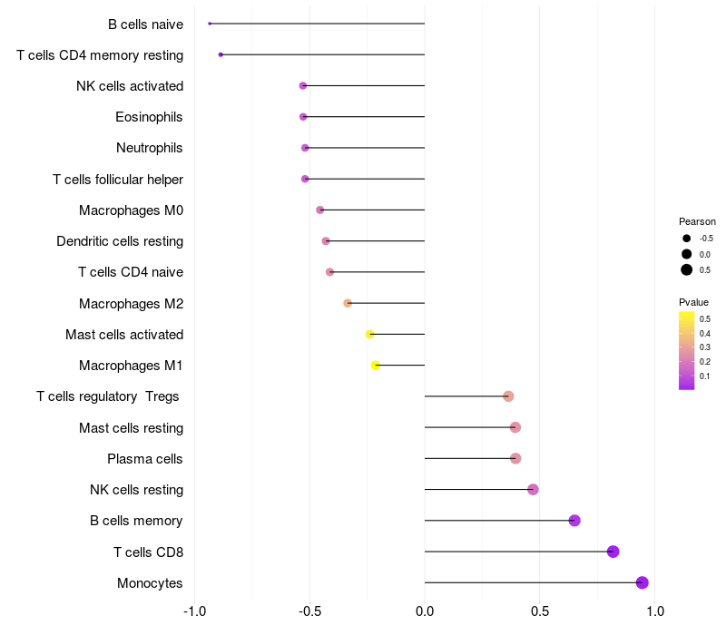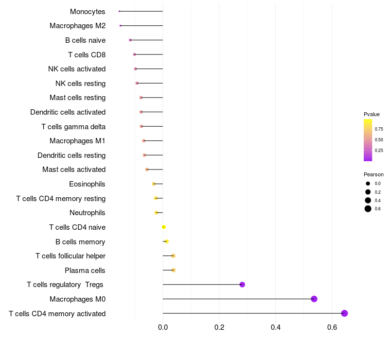 Lollipop of LYZ expression and immune infiltrating cell level correlation result in HBV+ samples