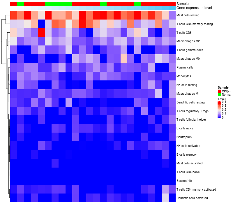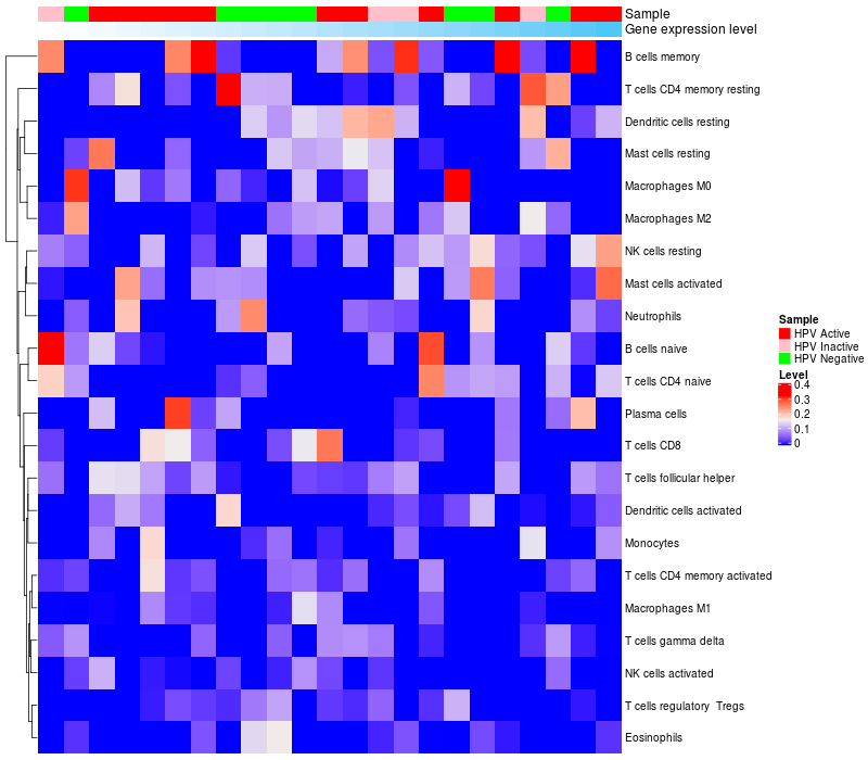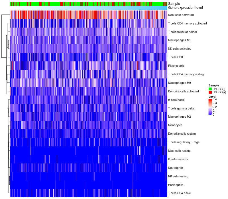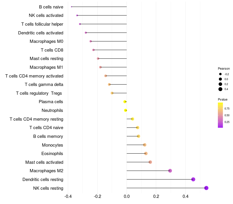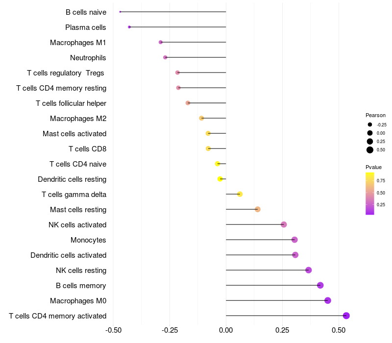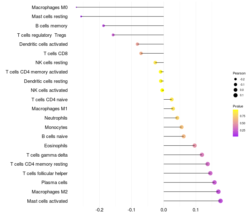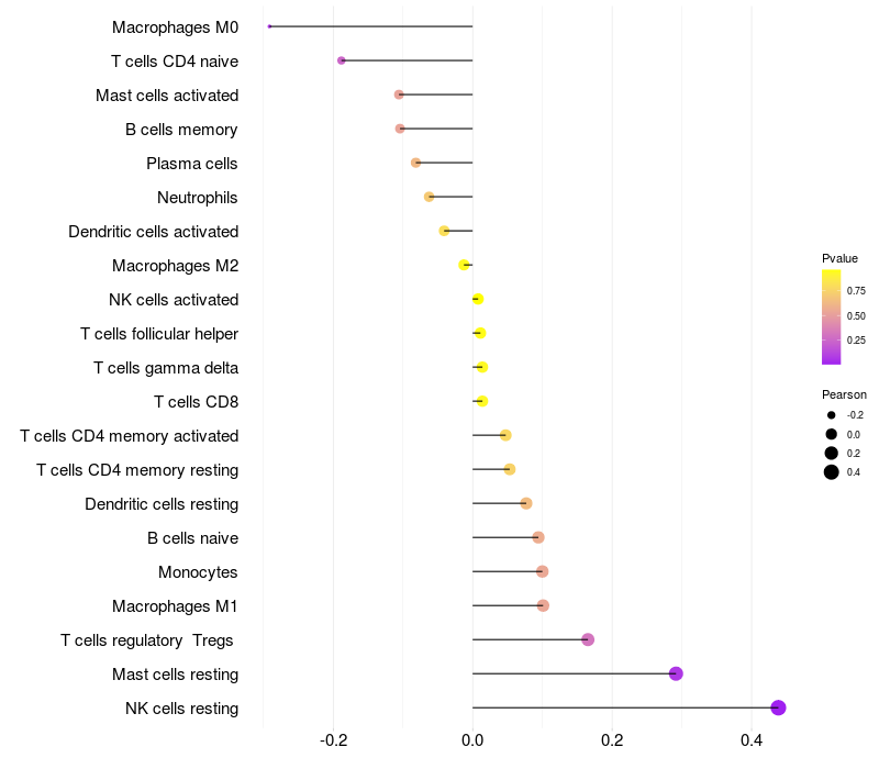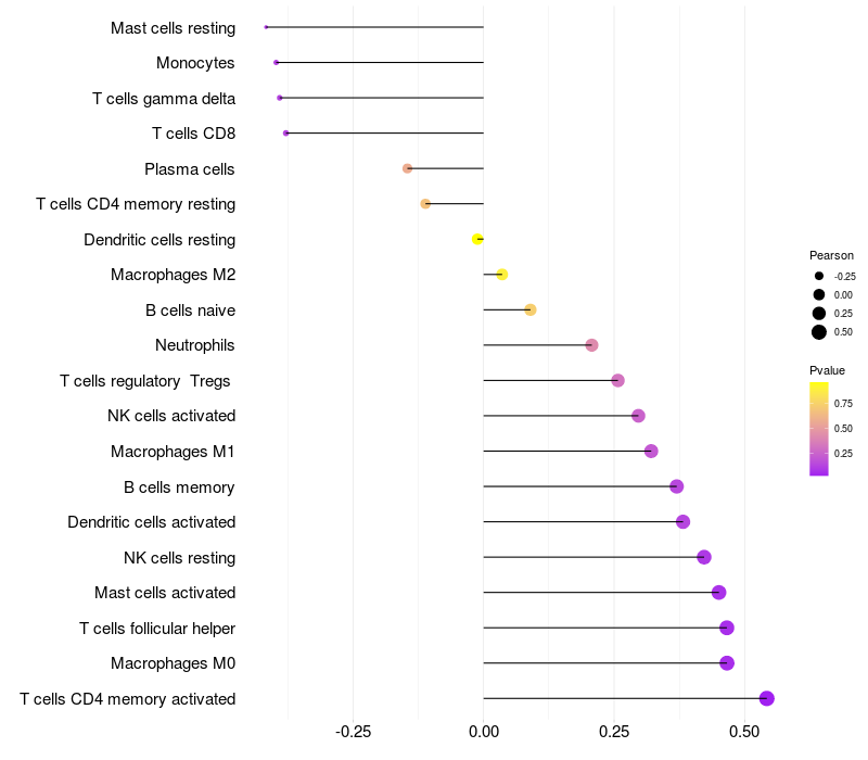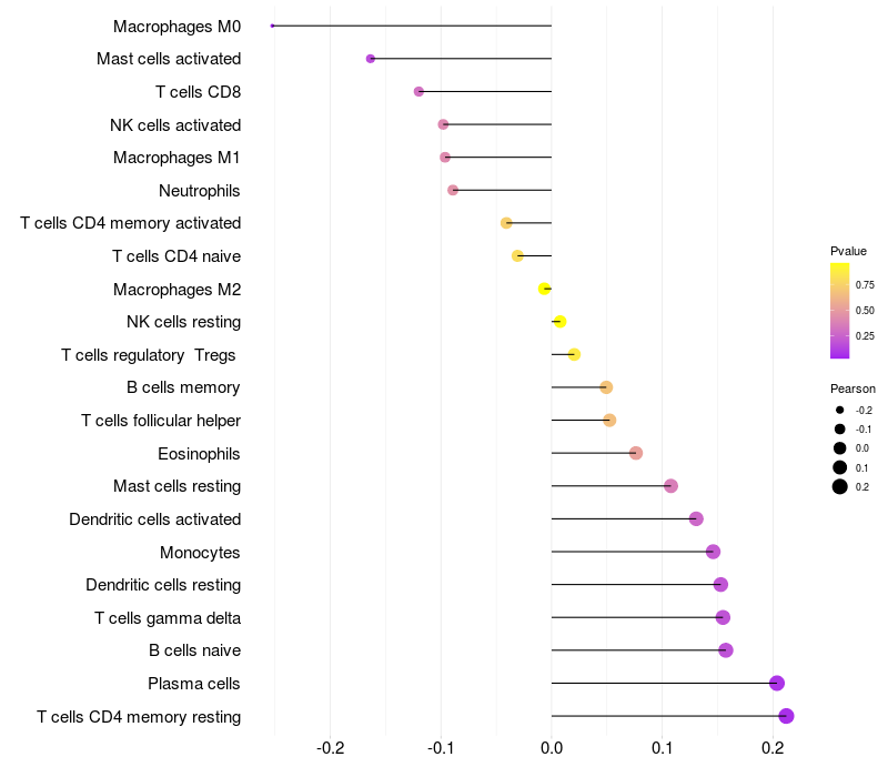 Lollipop of MAOA expression and immune infiltrating cell level correlation result in HPV+ samples