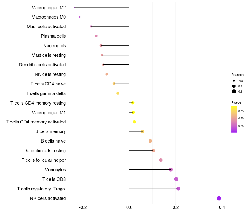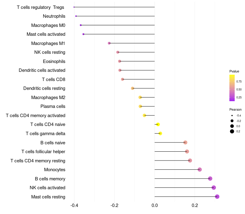 Lollipop of MC3R expression and immune infiltrating cell level correlation result in HPV+ samples
