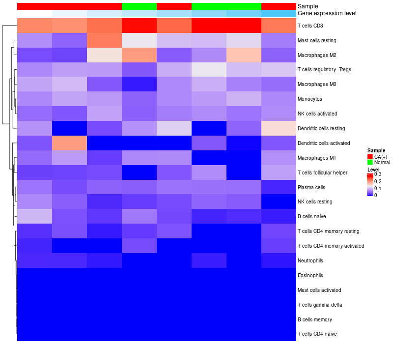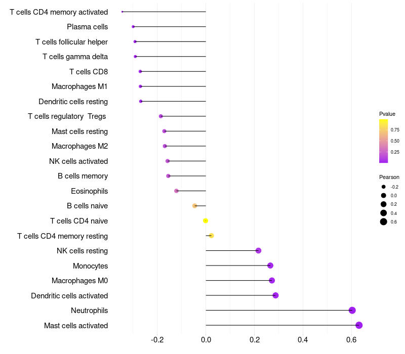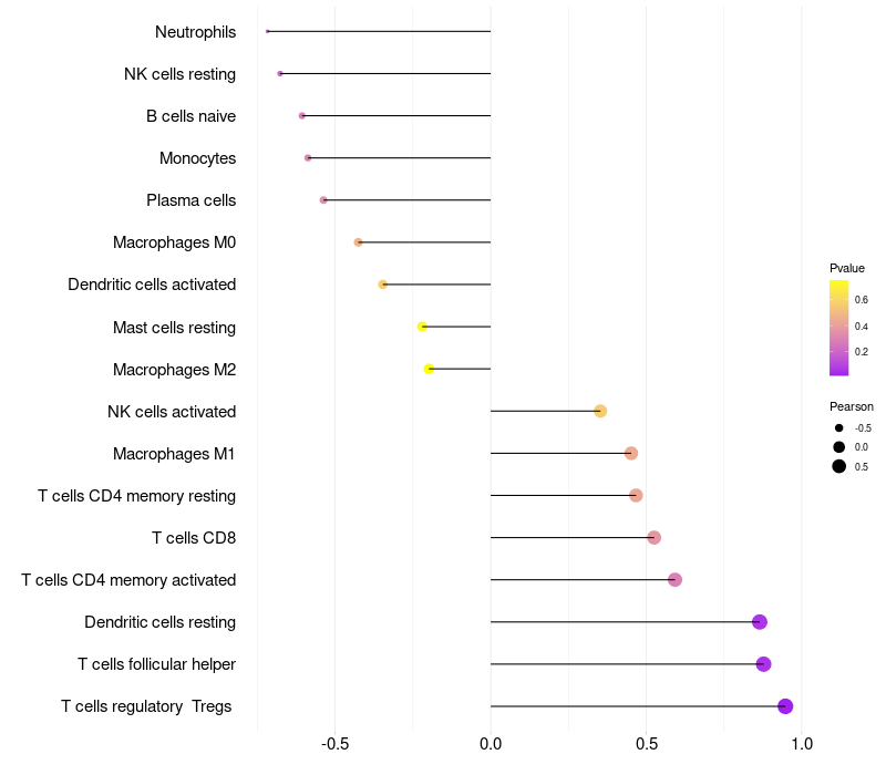 Lollipop of MIR1275 expression and immune infiltrating cell level correlation result in HPV+ samples
