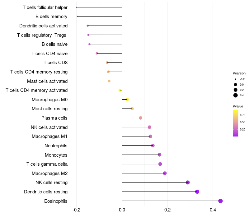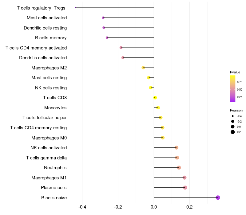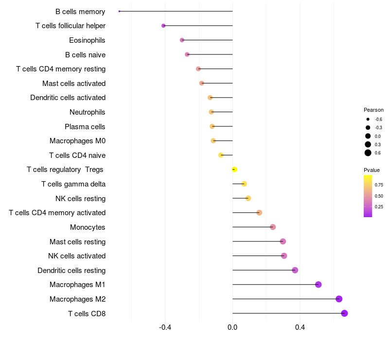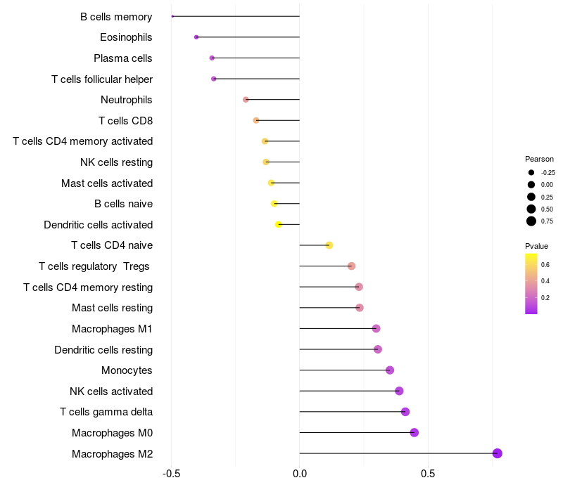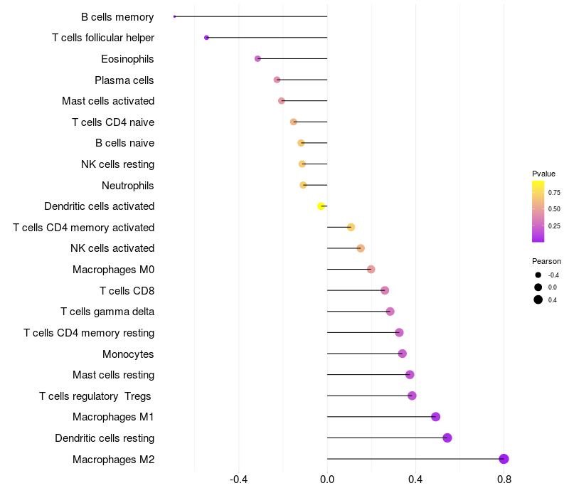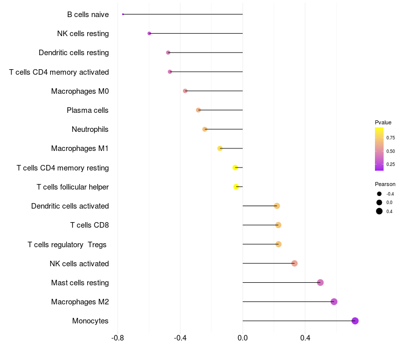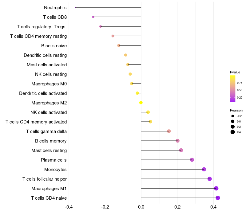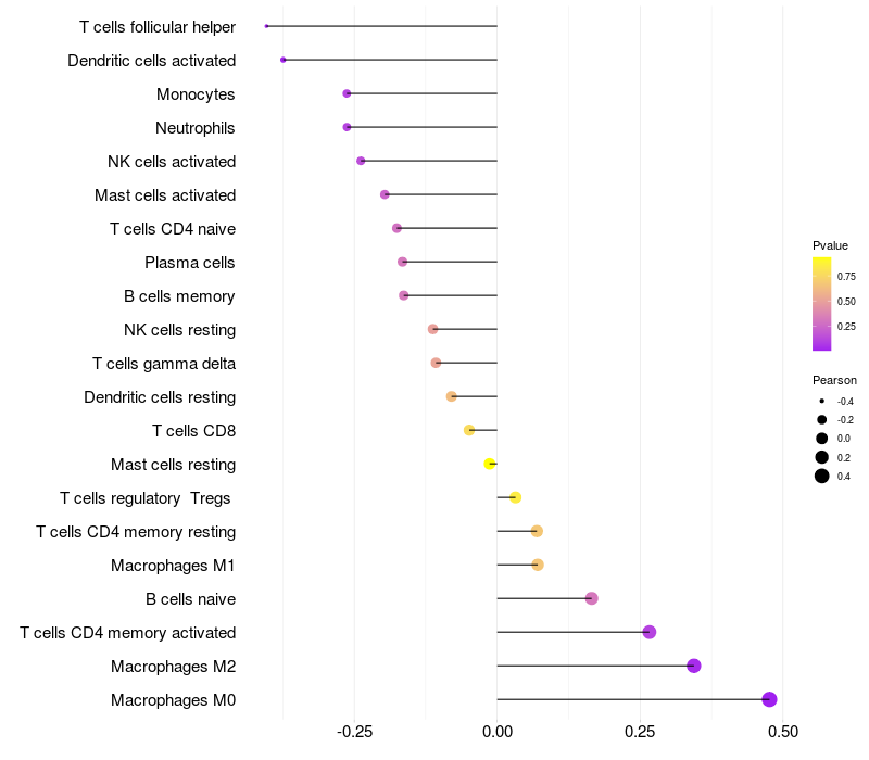 Lollipop of MSR1 expression and immune infiltrating cell level correlation result in HPV+ samples