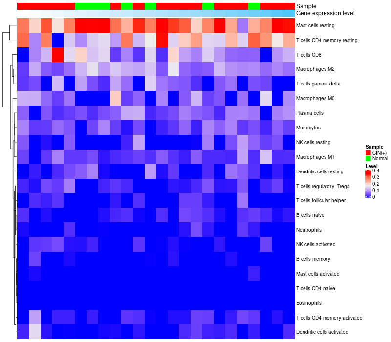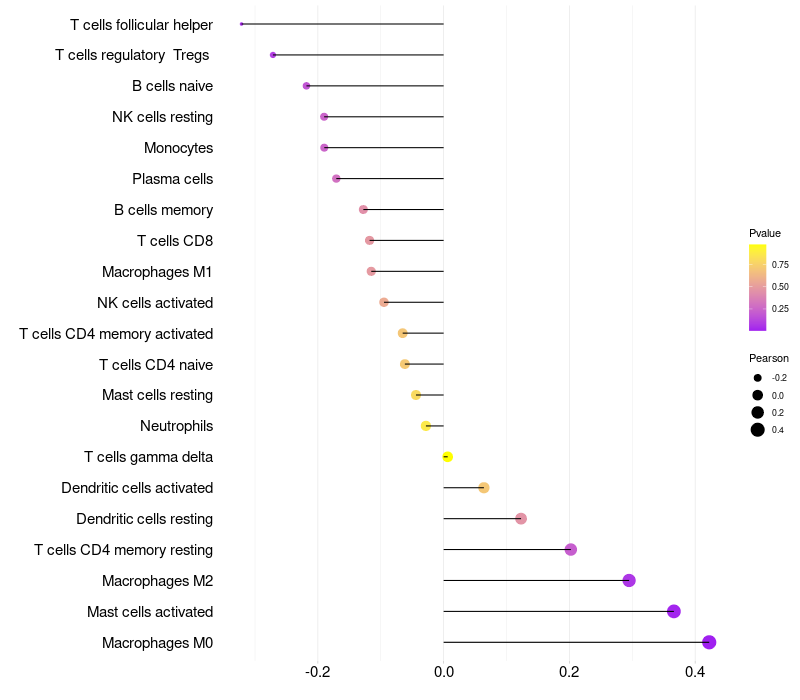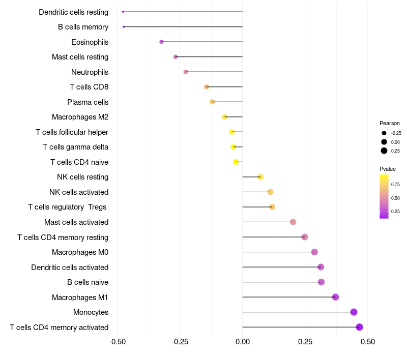 Lollipop of MSX2 expression and immune infiltrating cell level correlation result in HPV+ samples