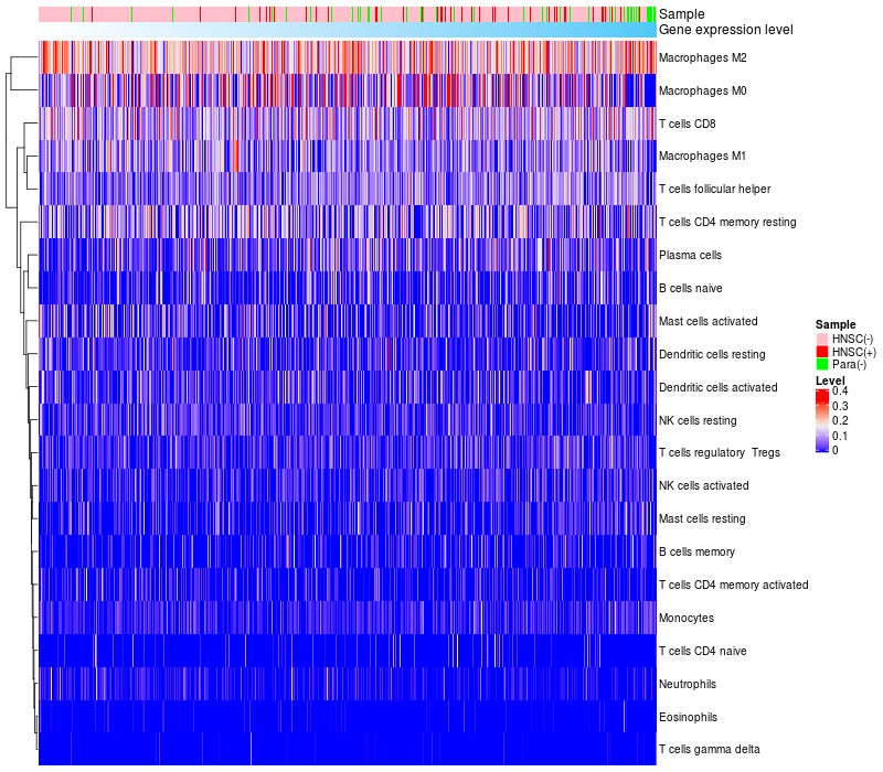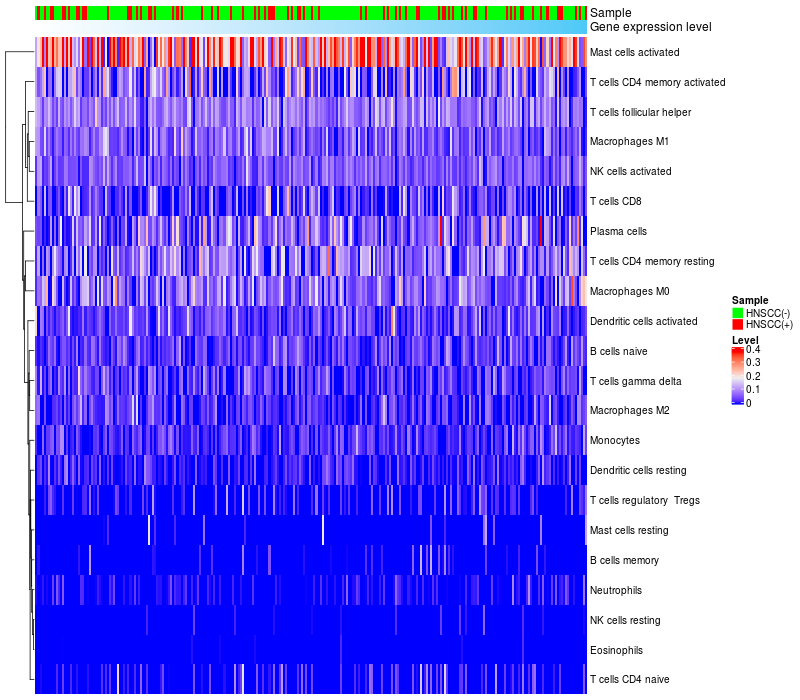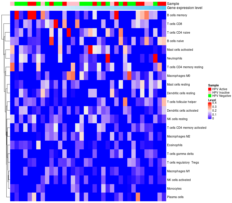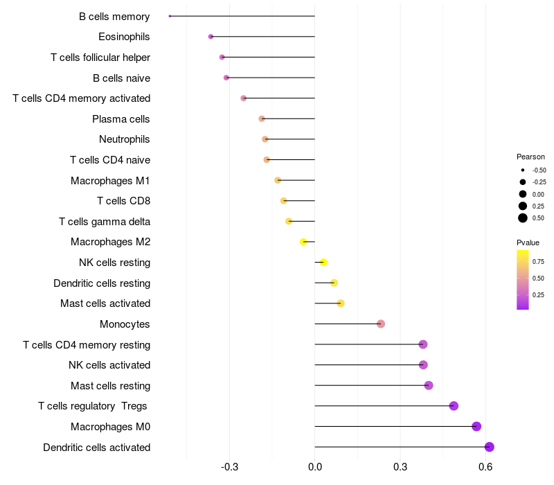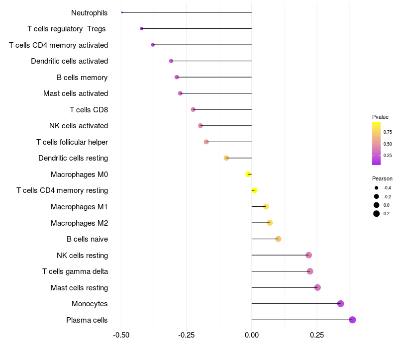 Lollipop of MYH7B expression and immune infiltrating cell level correlation result in HPV+ samples