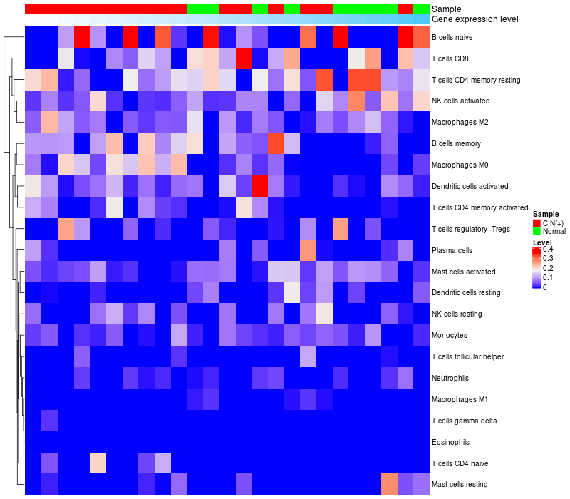 • Left: Heatmap of target gene expression and the level of various types of immune cells (cell type fractions) in all samples based on CIBERSORT method.