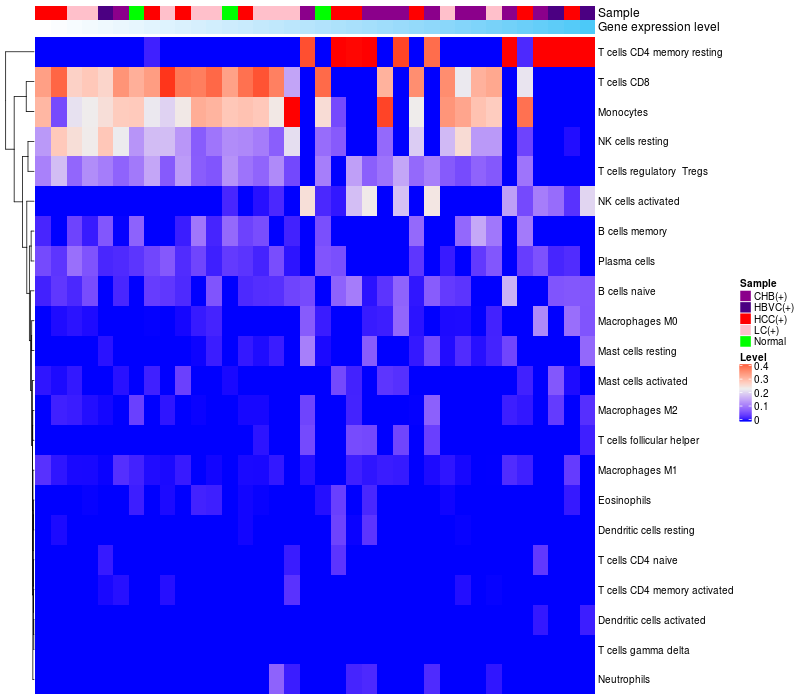 Chronic hepatitis B patients (HBV+)(10),Hepatocellular carcinoma (HBV+)(10),Liver cirrhosis(HBV+)(10),Normal(3),HBV carriers (3) |