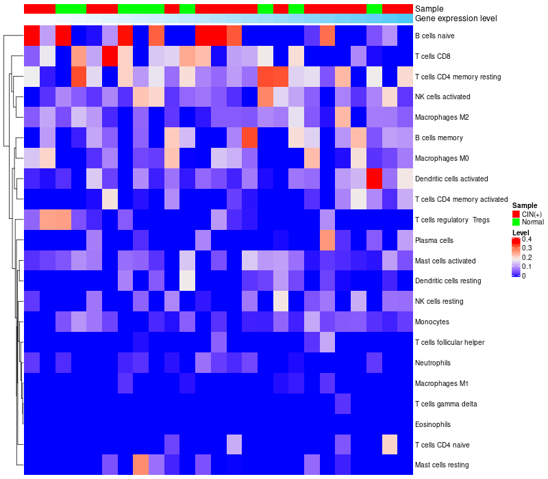 • Left: Heatmap of target gene expression and the level of various types of immune cells (cell type fractions) in all samples based on CIBERSORT method.