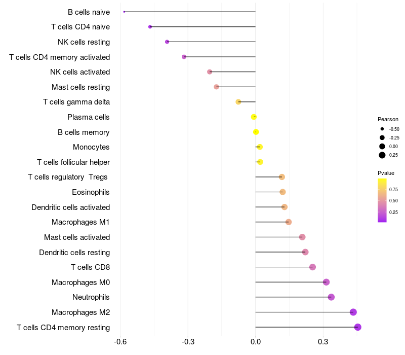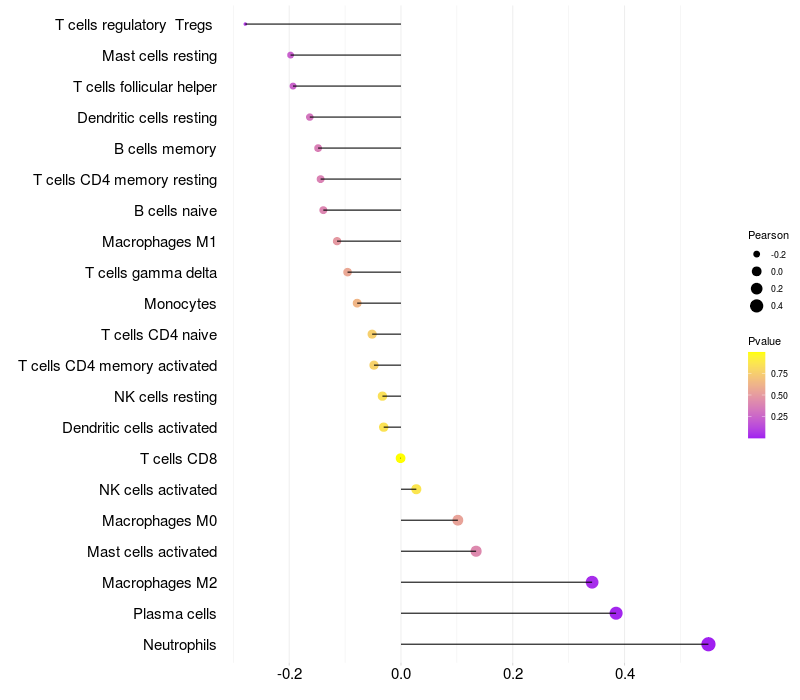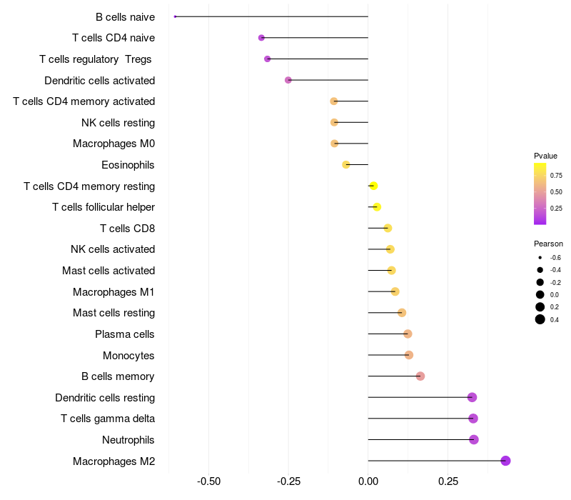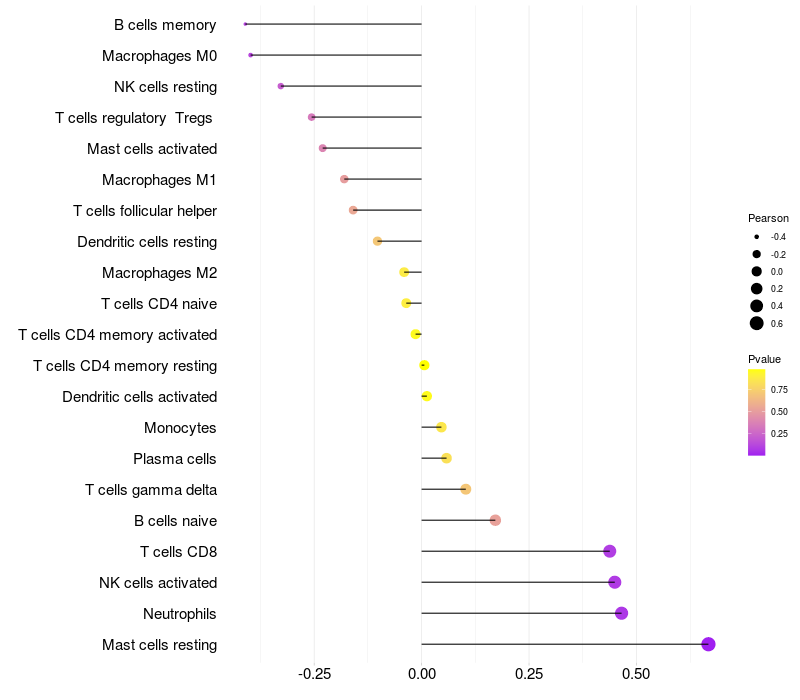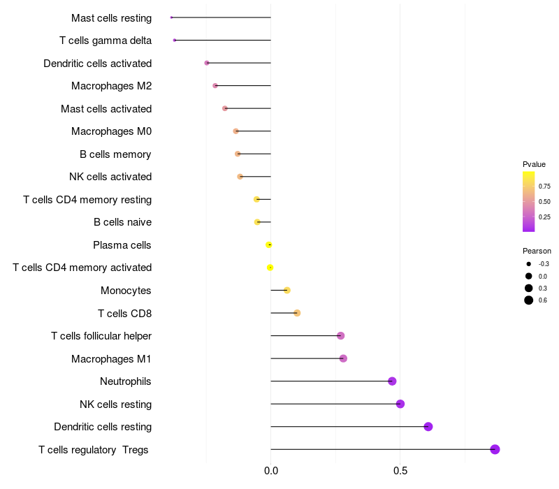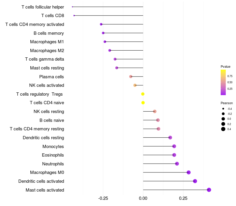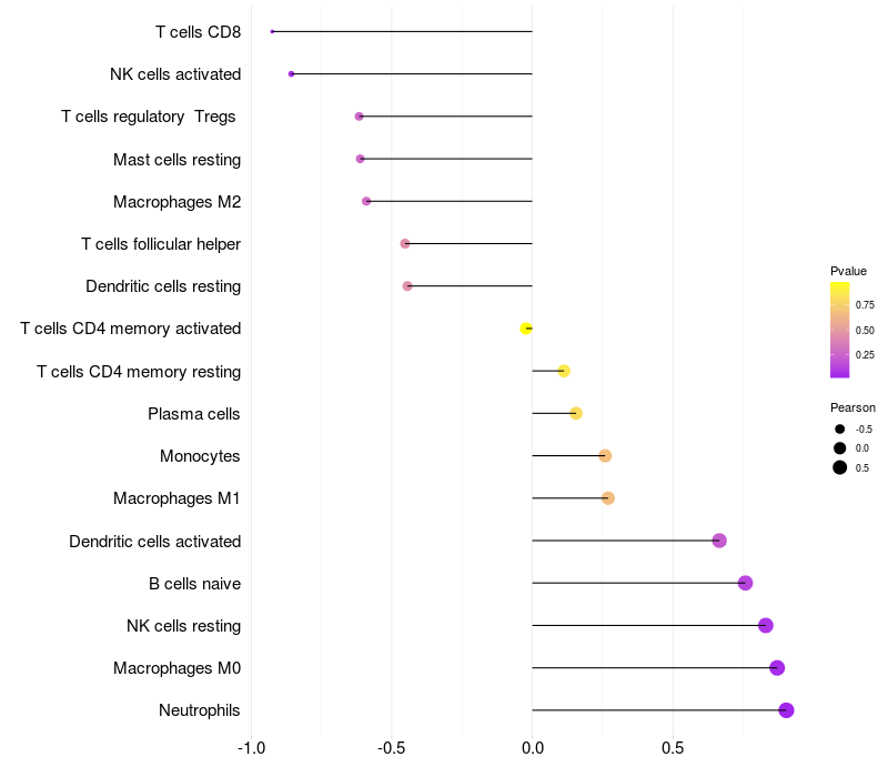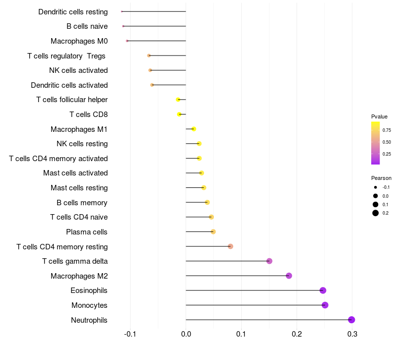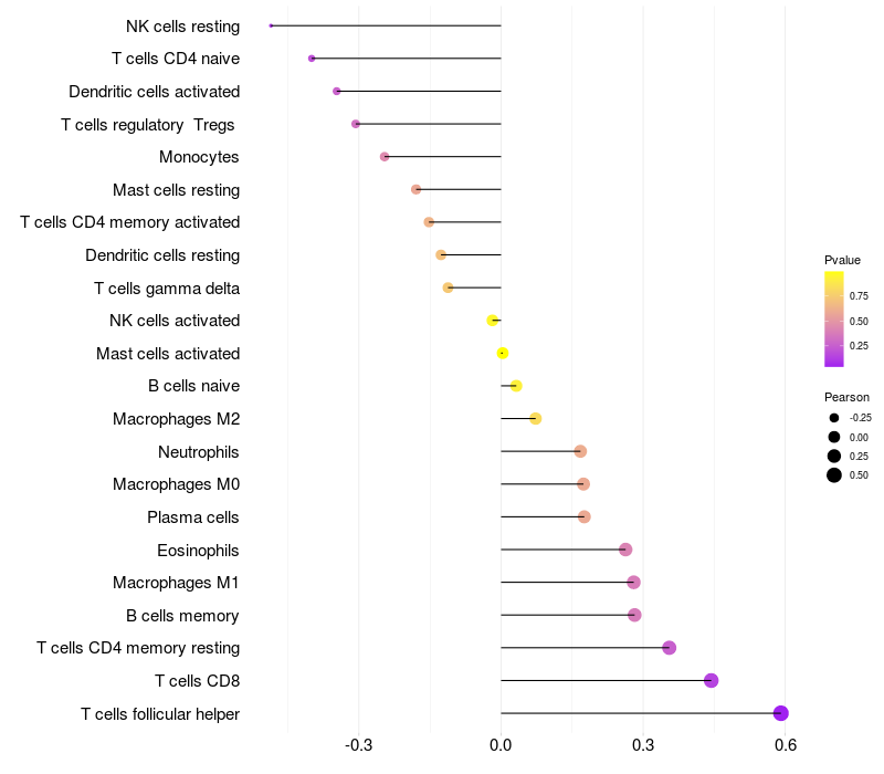 Lollipop of NGEF expression and immune infiltrating cell level correlation result in HPV+ samples