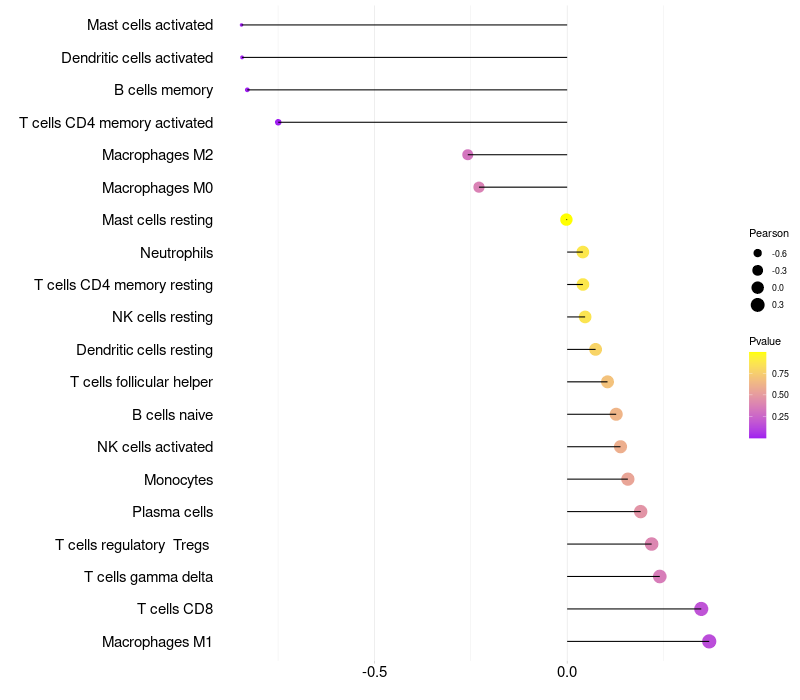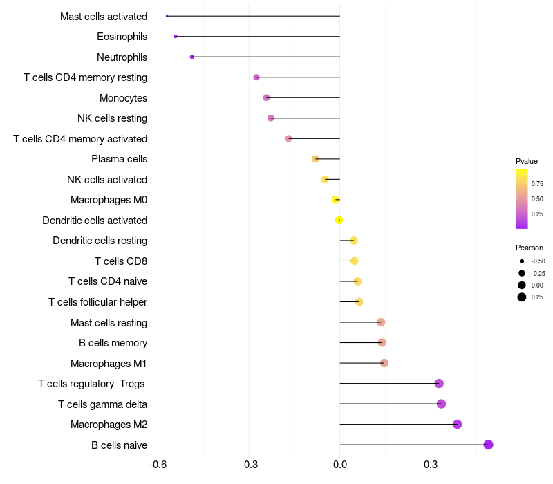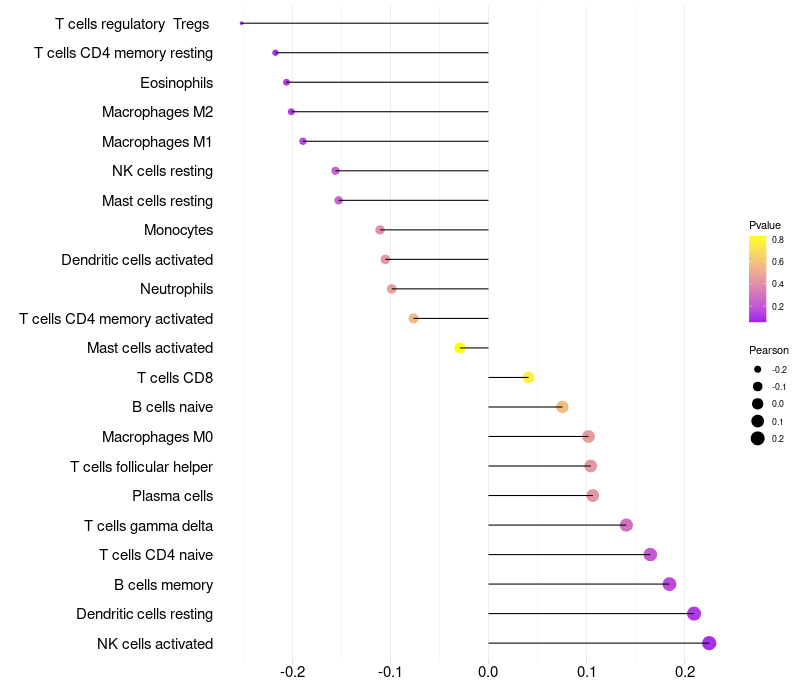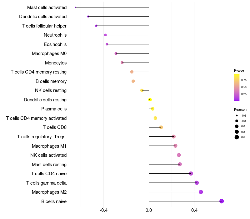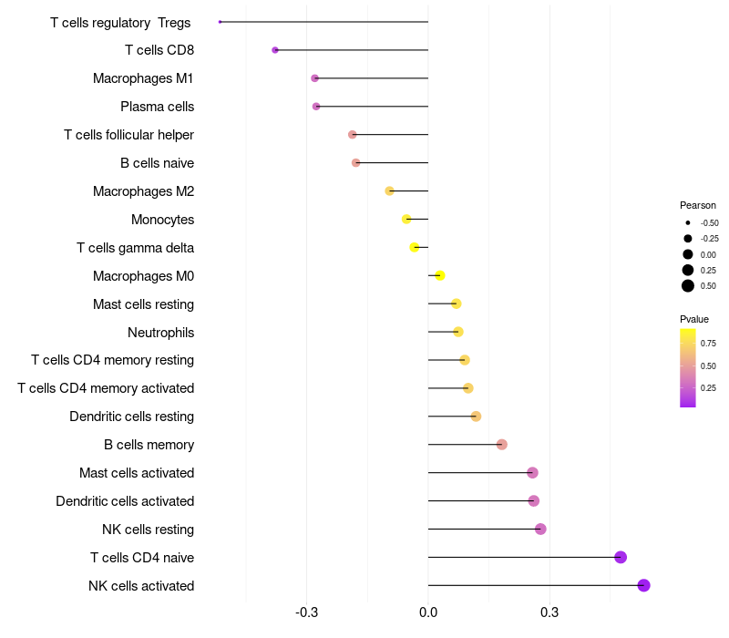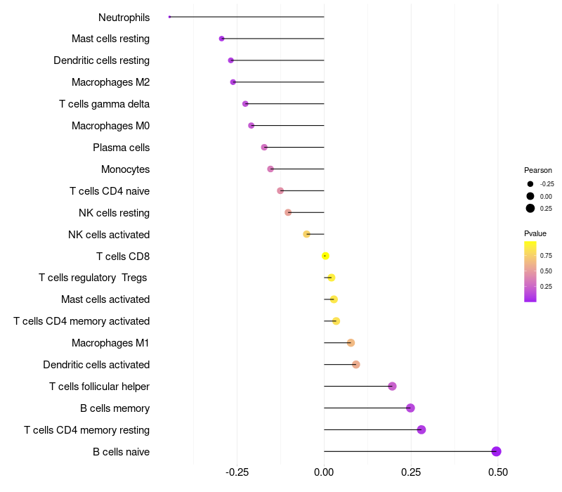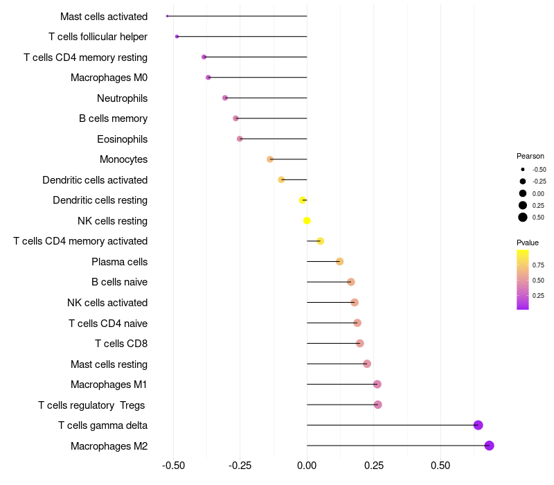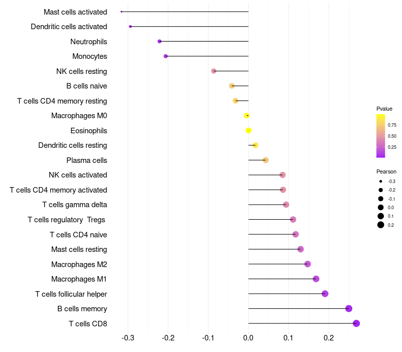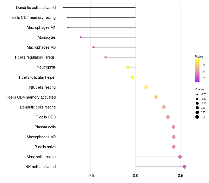 Lollipop of NHLRC3 expression and immune infiltrating cell level correlation result in HPV+ samples