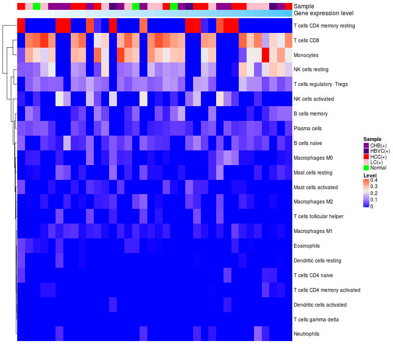 Chronic hepatitis B patients (HBV+)(10),Hepatocellular carcinoma (HBV+)(10),Liver cirrhosis(HBV+)(10),Normal(3),HBV carriers (3) |