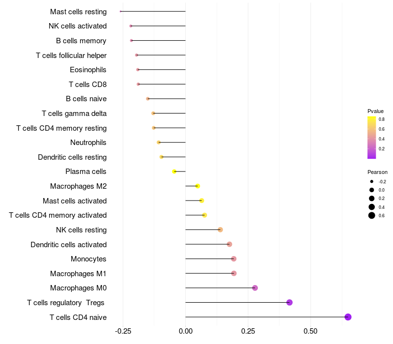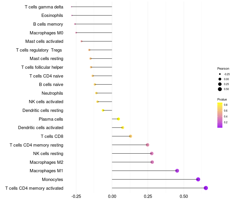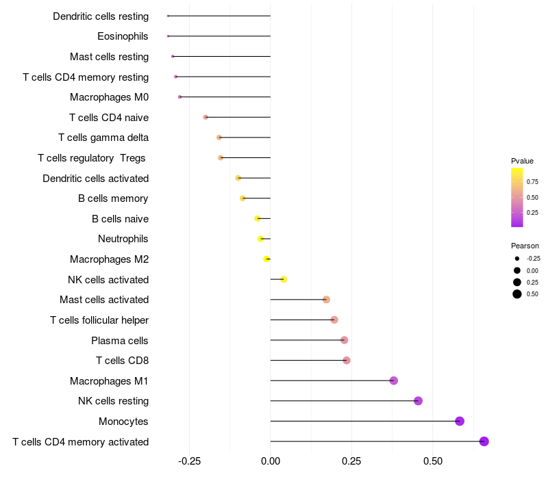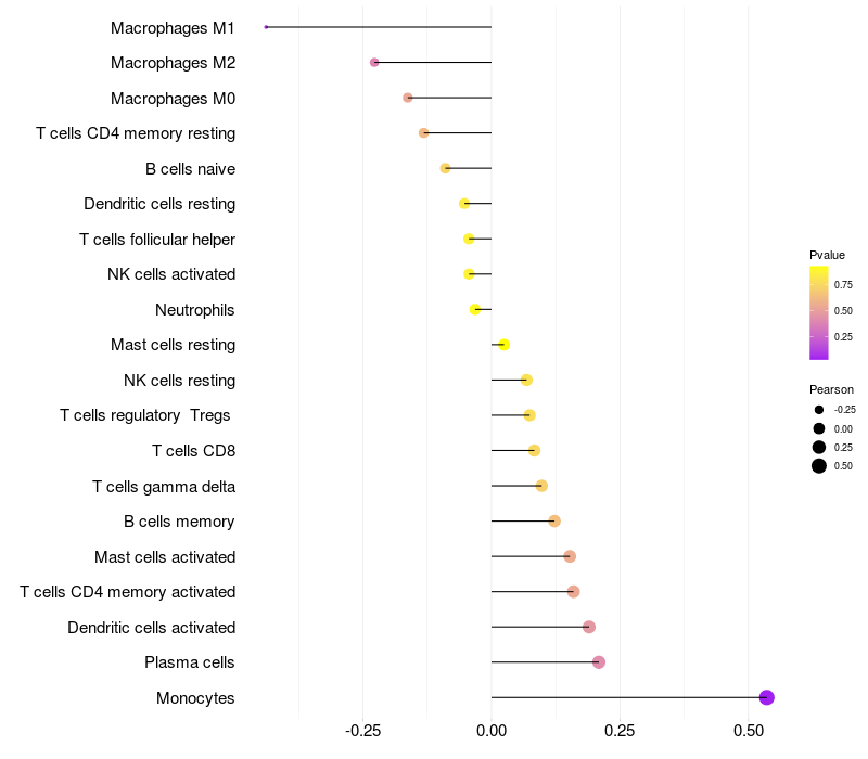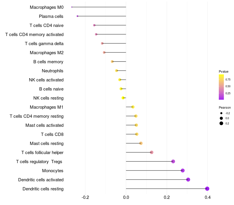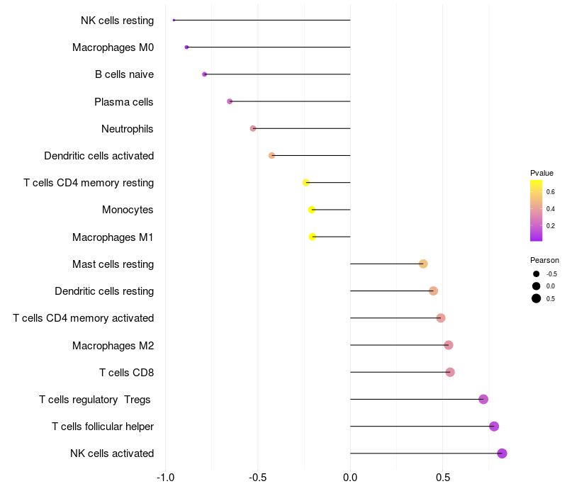 Lollipop of NMBR expression and immune infiltrating cell level correlation result in HPV+ samples