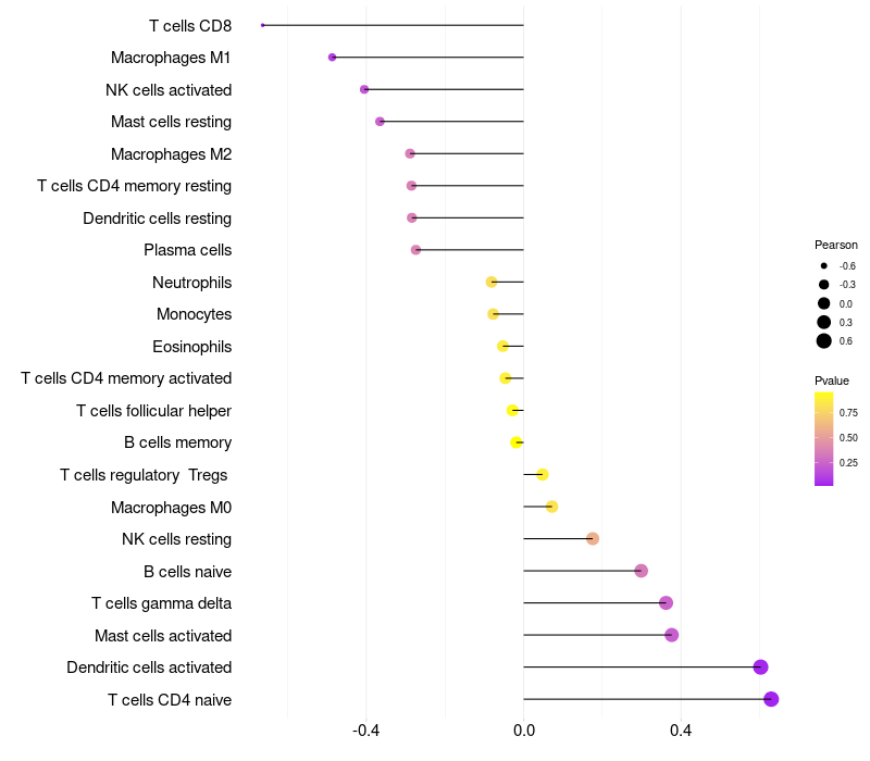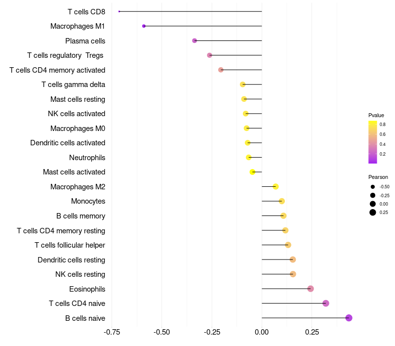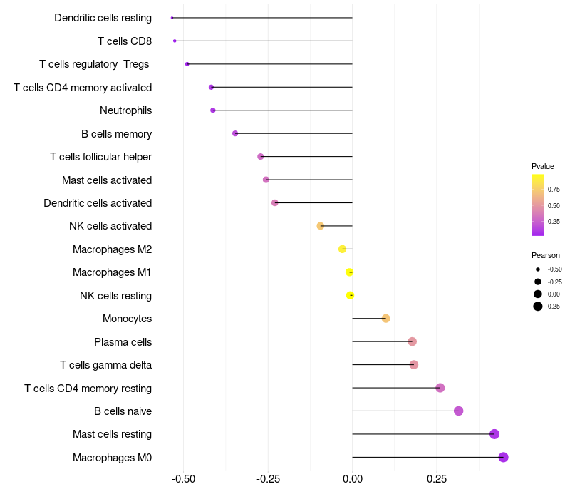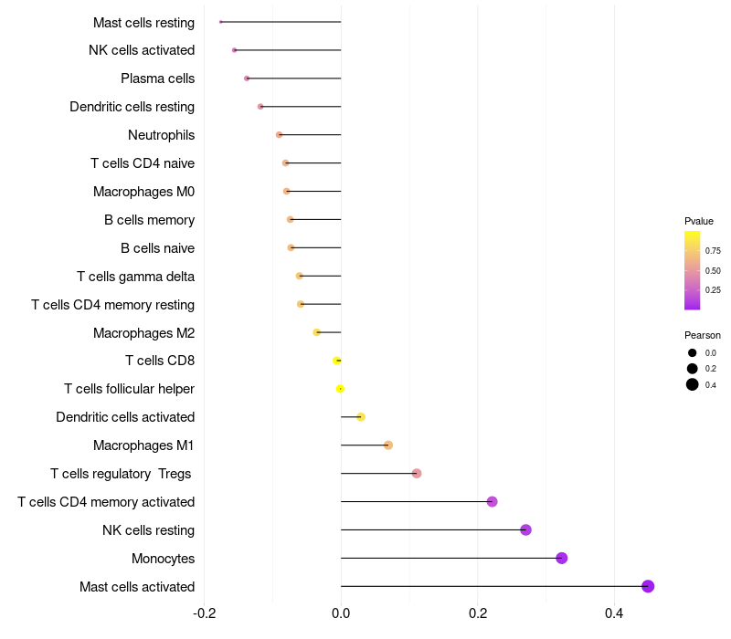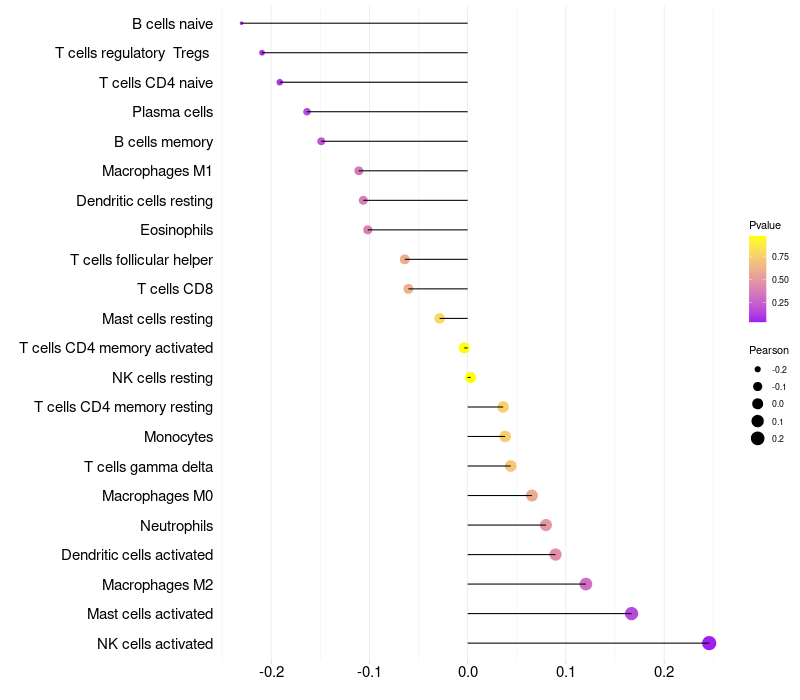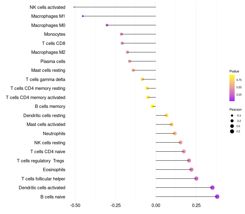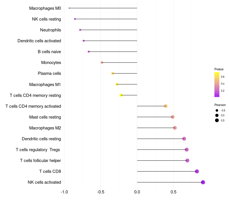 Lollipop of NPY expression and immune infiltrating cell level correlation result in HPV+ samples