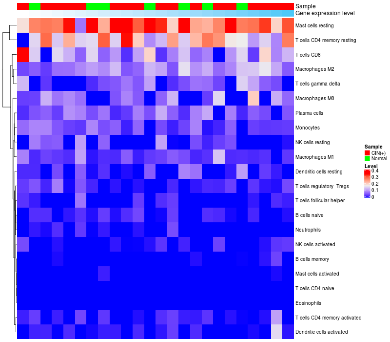 • Left: Heatmap of target gene expression and the level of various types of immune cells (cell type fractions) in all samples based on CIBERSORT method.