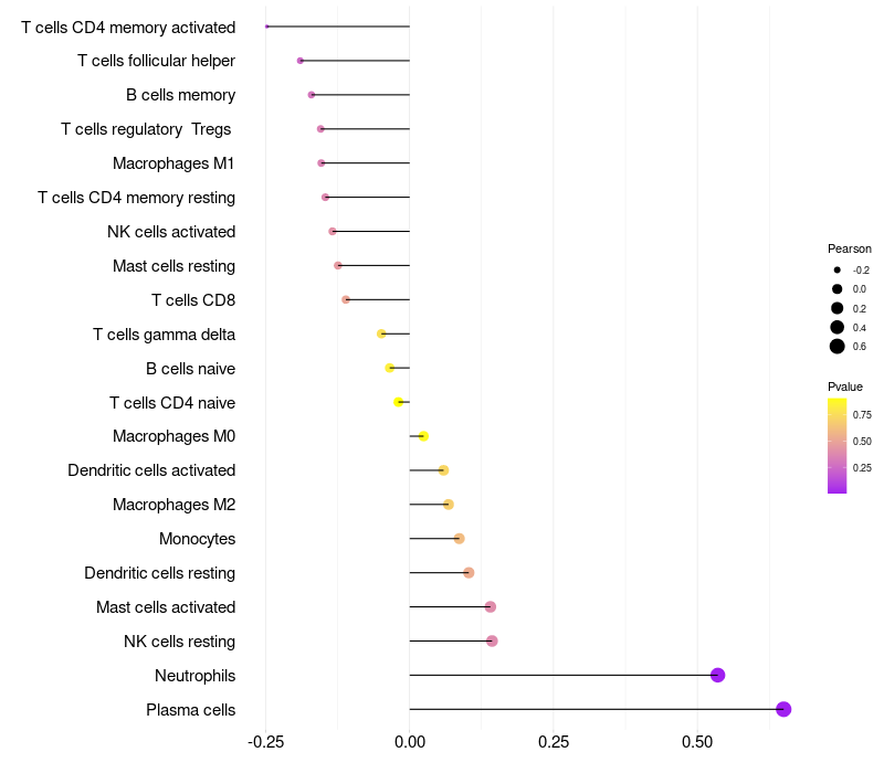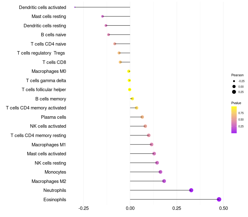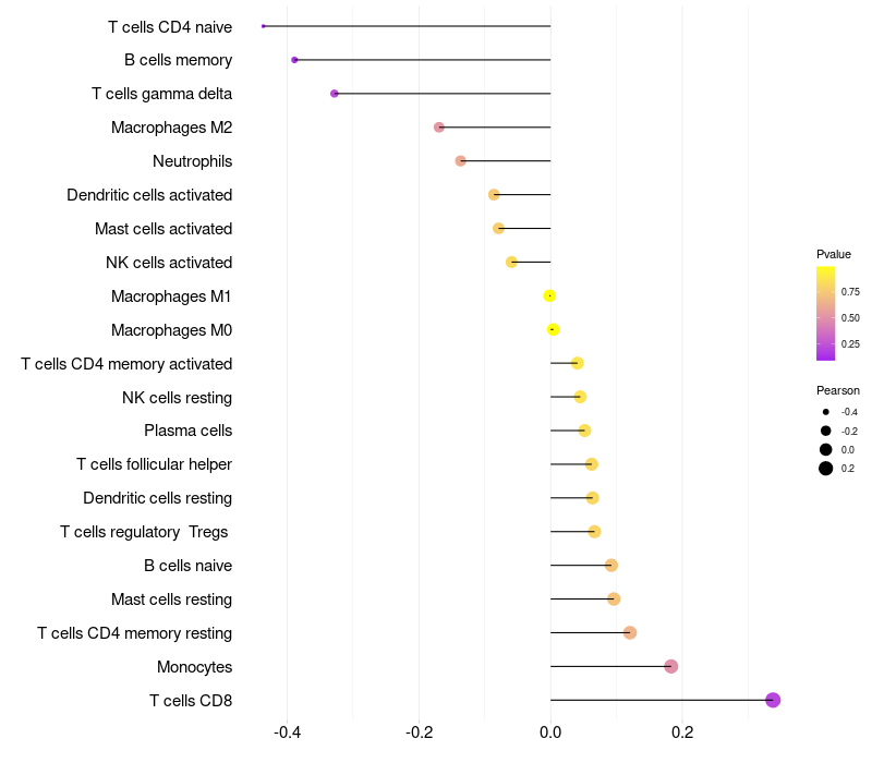 Lollipop of NRG4 expression and immune infiltrating cell level correlation result in HPV+ samples