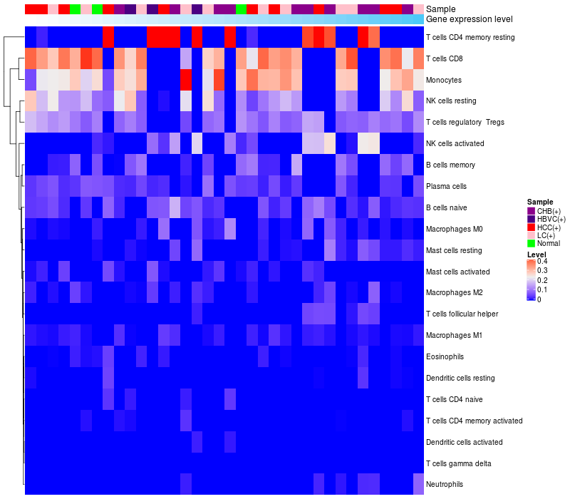 Chronic hepatitis B patients (HBV+)(10),Hepatocellular carcinoma (HBV+)(10),Liver cirrhosis(HBV+)(10),Normal(3),HBV carriers (3) |