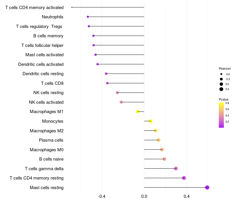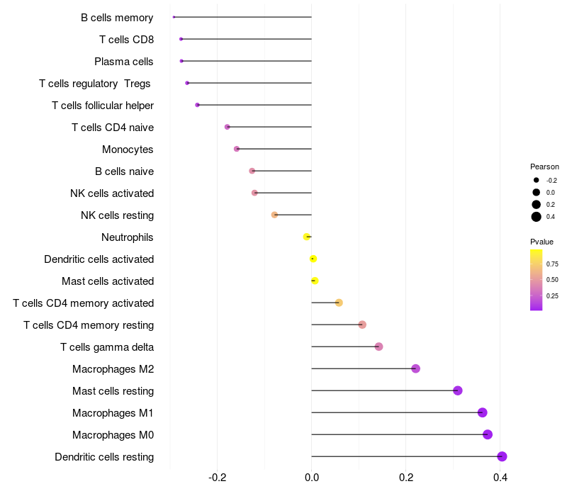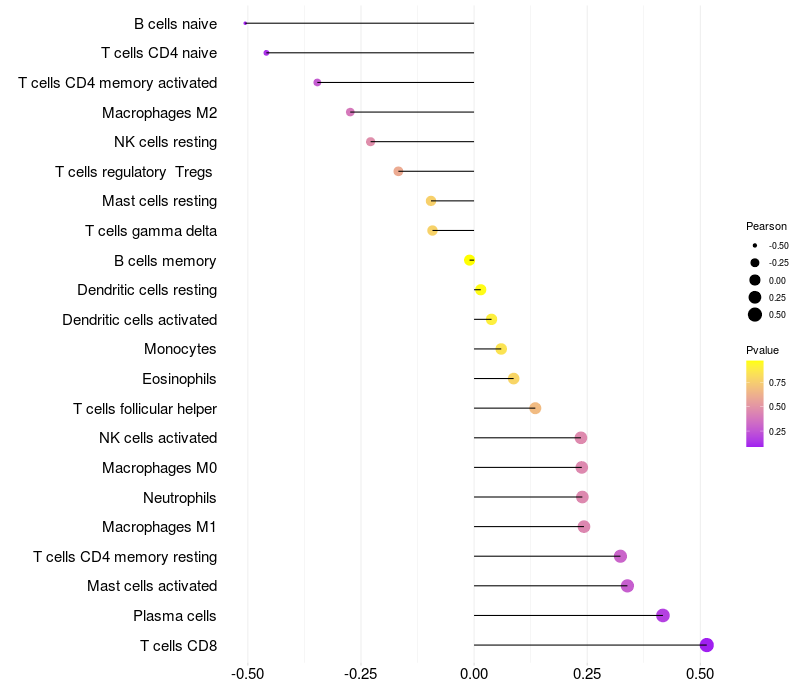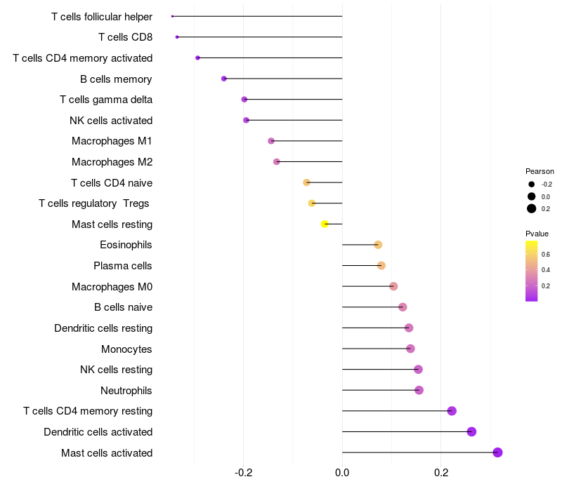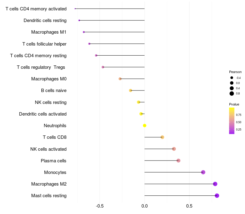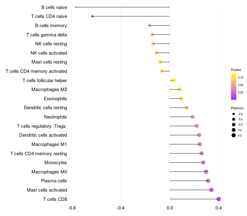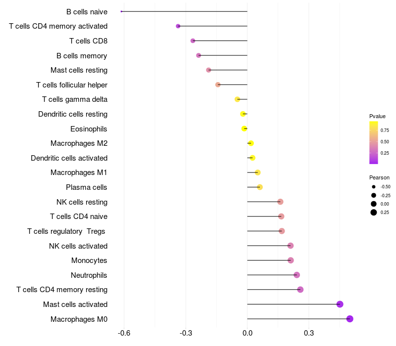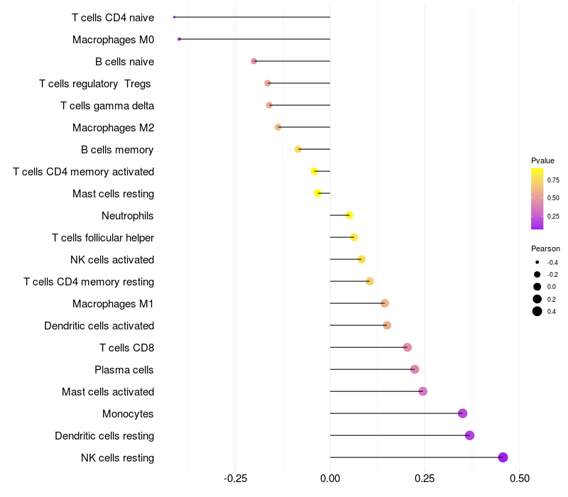 Lollipop of PALLD expression and immune infiltrating cell level correlation result in HPV+ samples