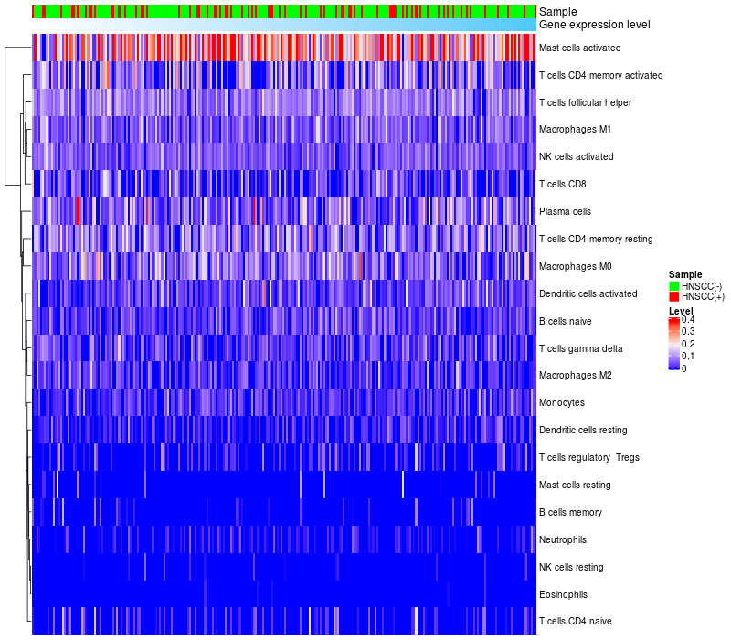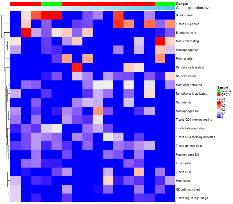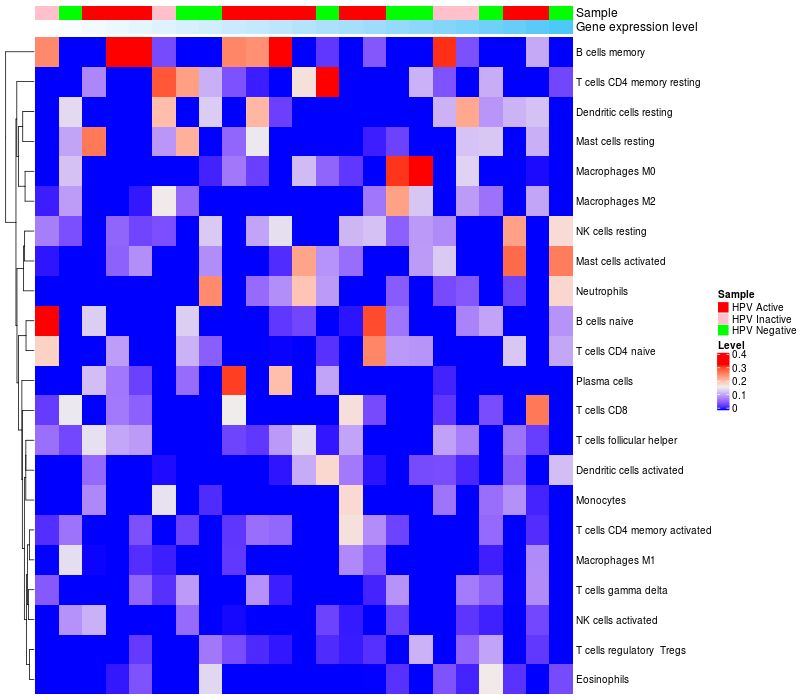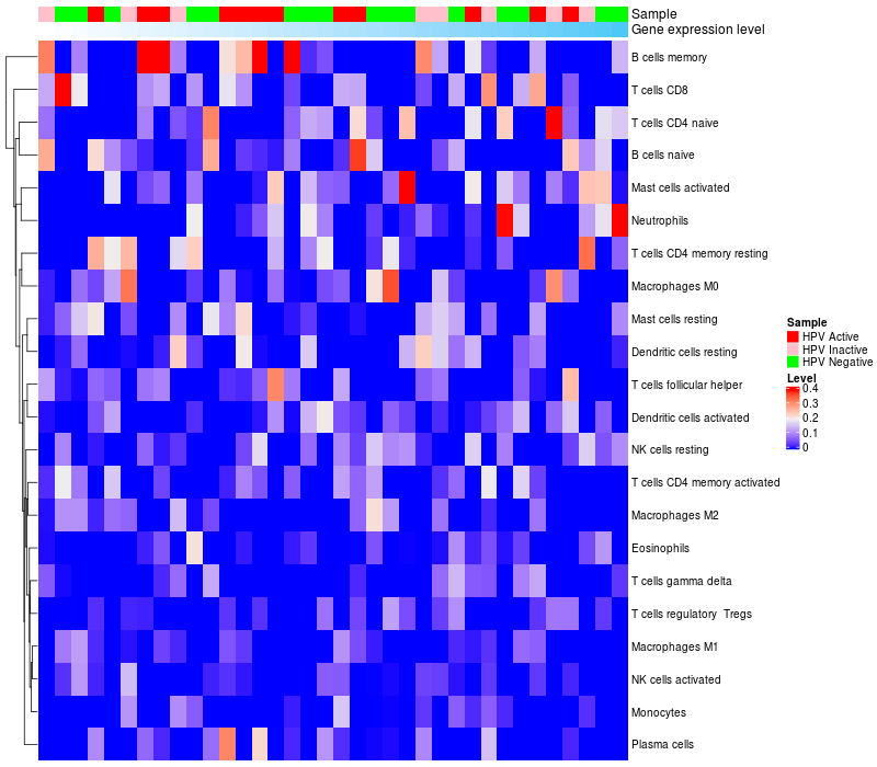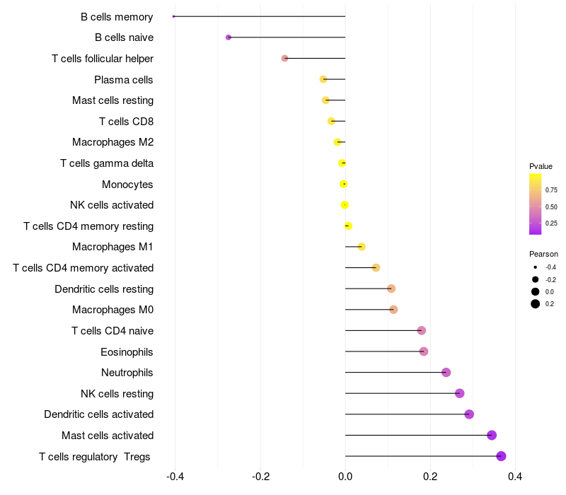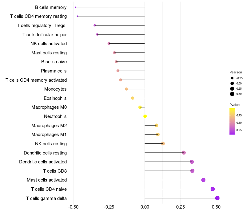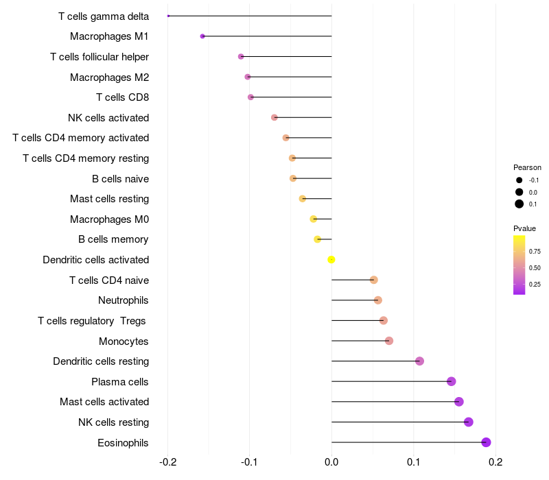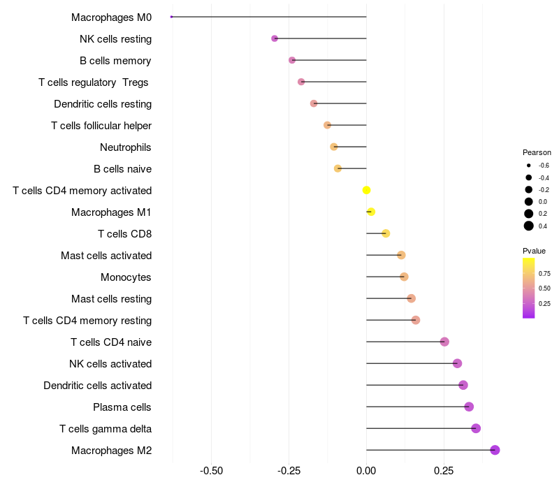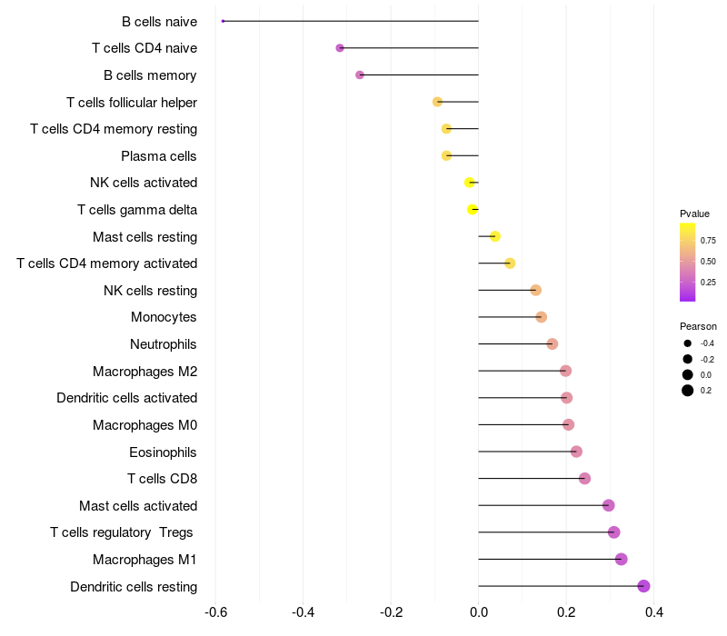 Lollipop of PCDH1 expression and immune infiltrating cell level correlation result in HPV+ samples