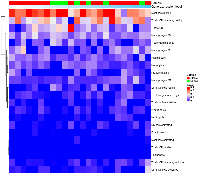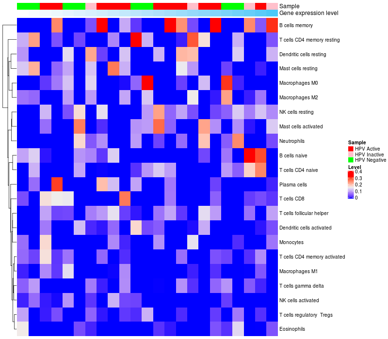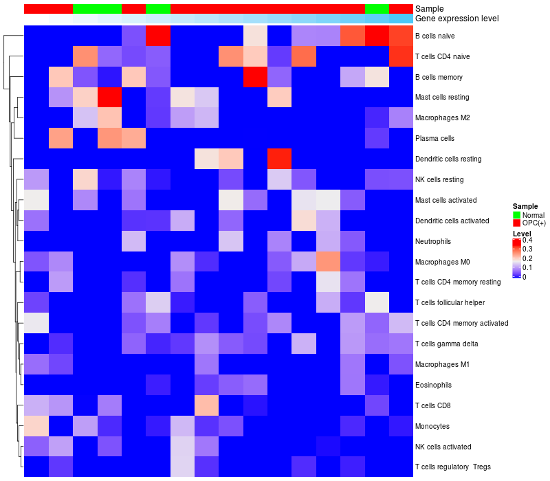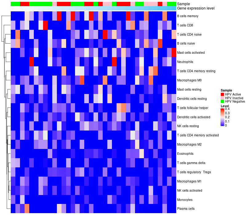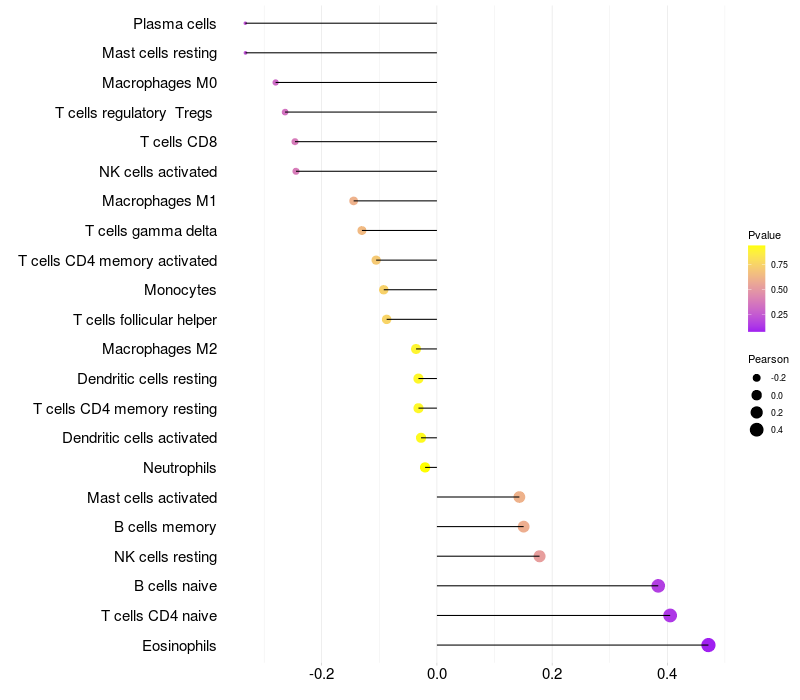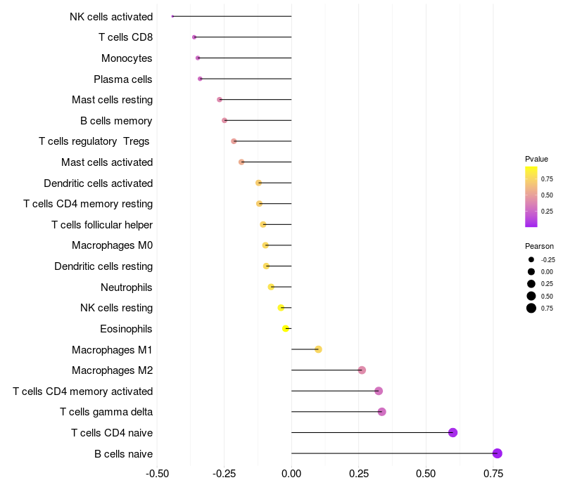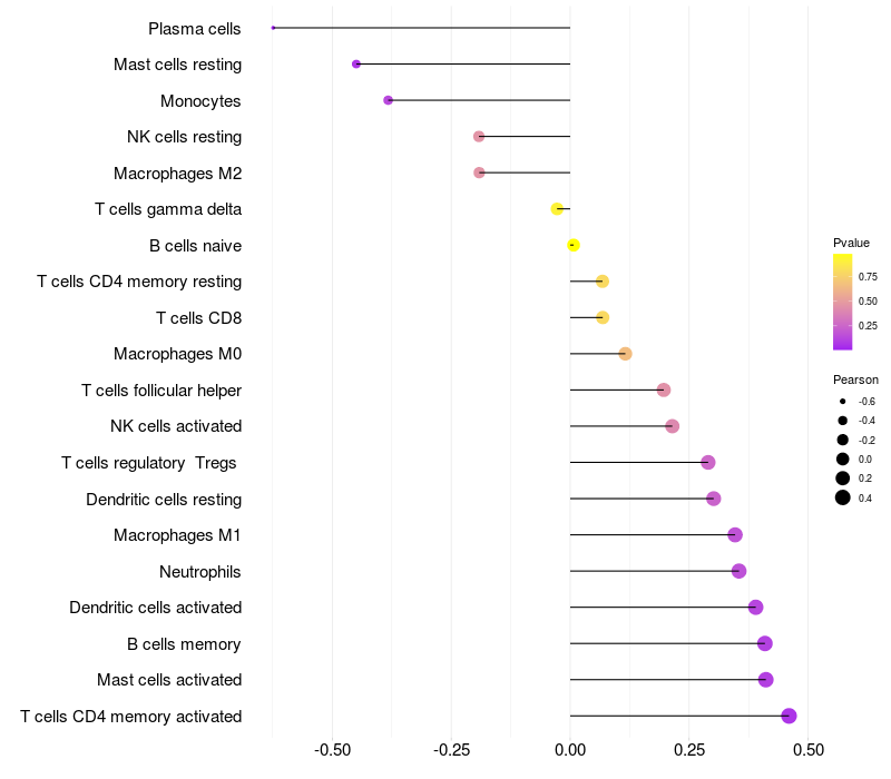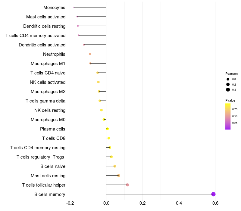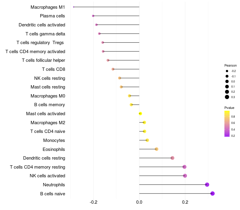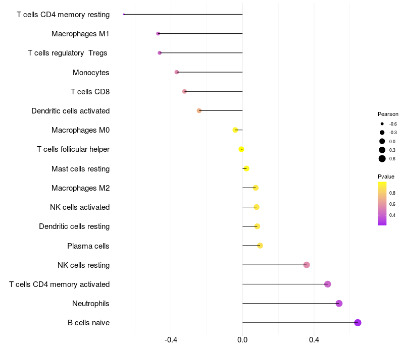 Lollipop of PCGEM1 expression and immune infiltrating cell level correlation result in HPV+ samples