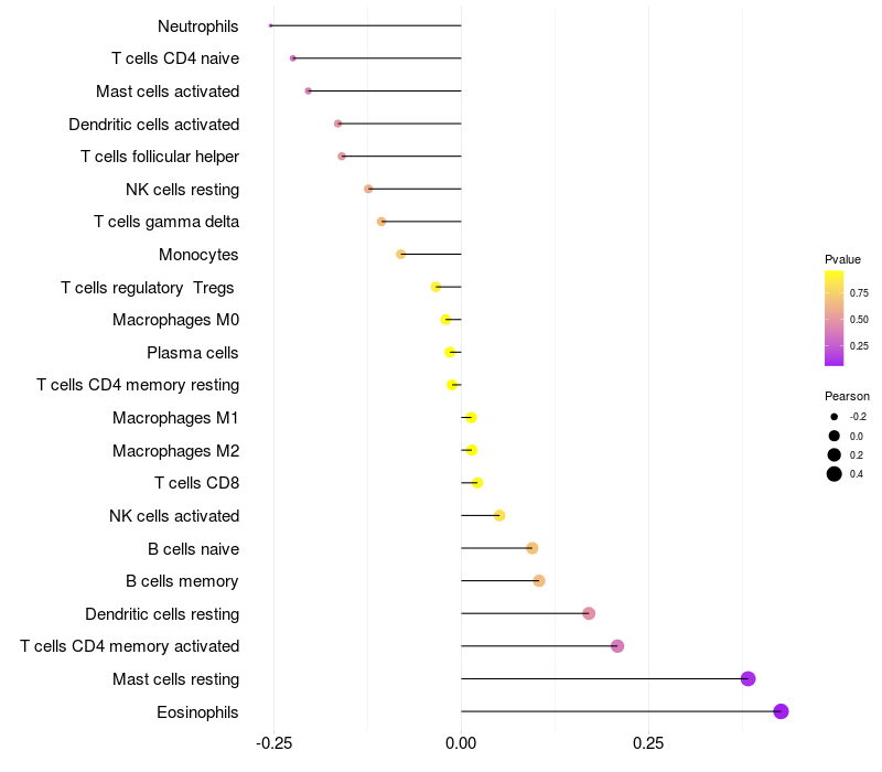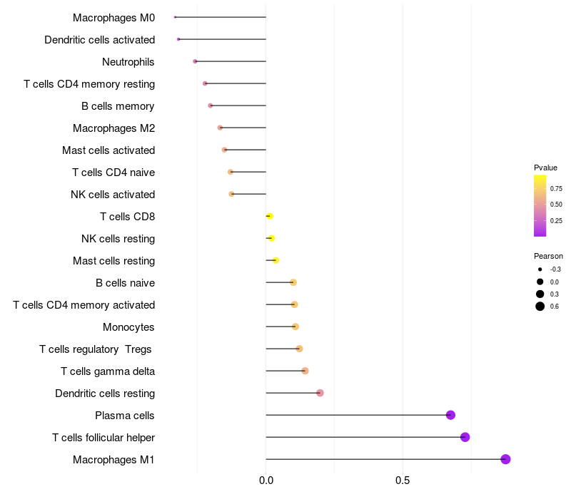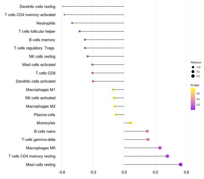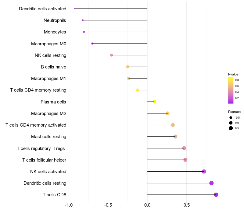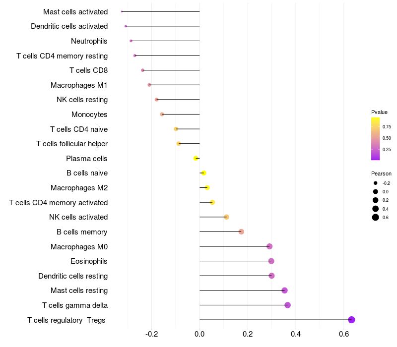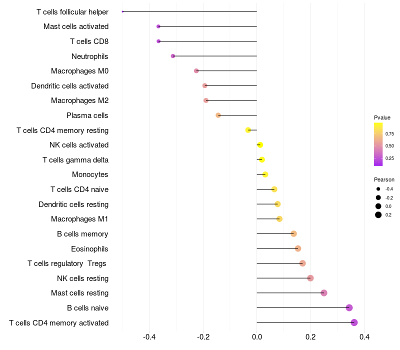 Lollipop of PCP4 expression and immune infiltrating cell level correlation result in HPV+ samples