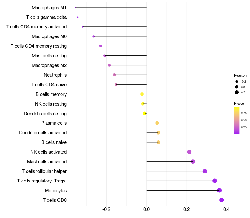 Lollipop of PGAP3 expression and immune infiltrating cell level correlation result in HPV+ samples