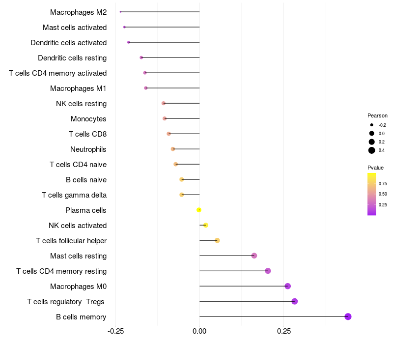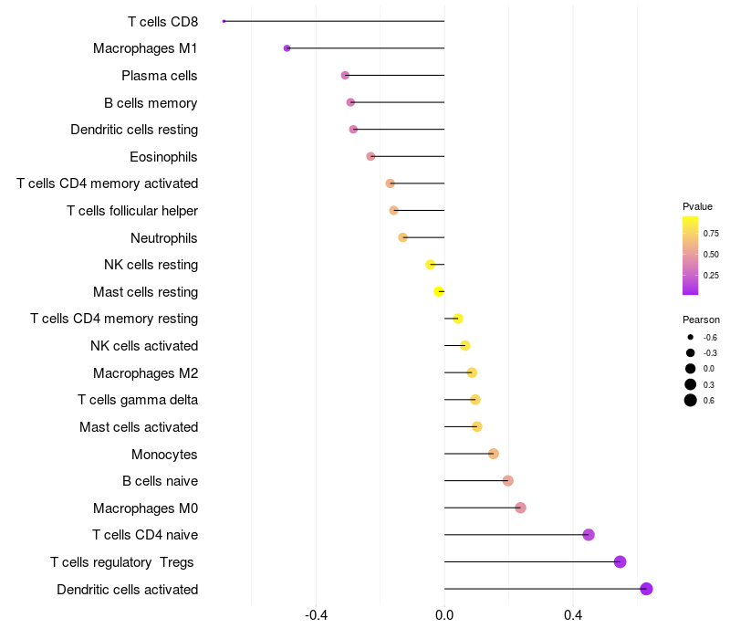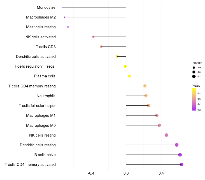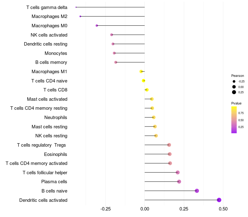 Lollipop of PLA2G2E expression and immune infiltrating cell level correlation result in HPV+ samples