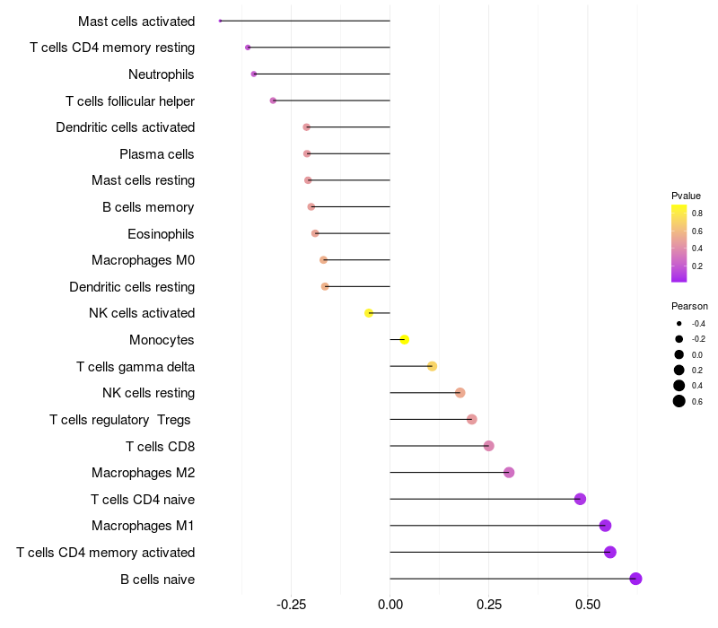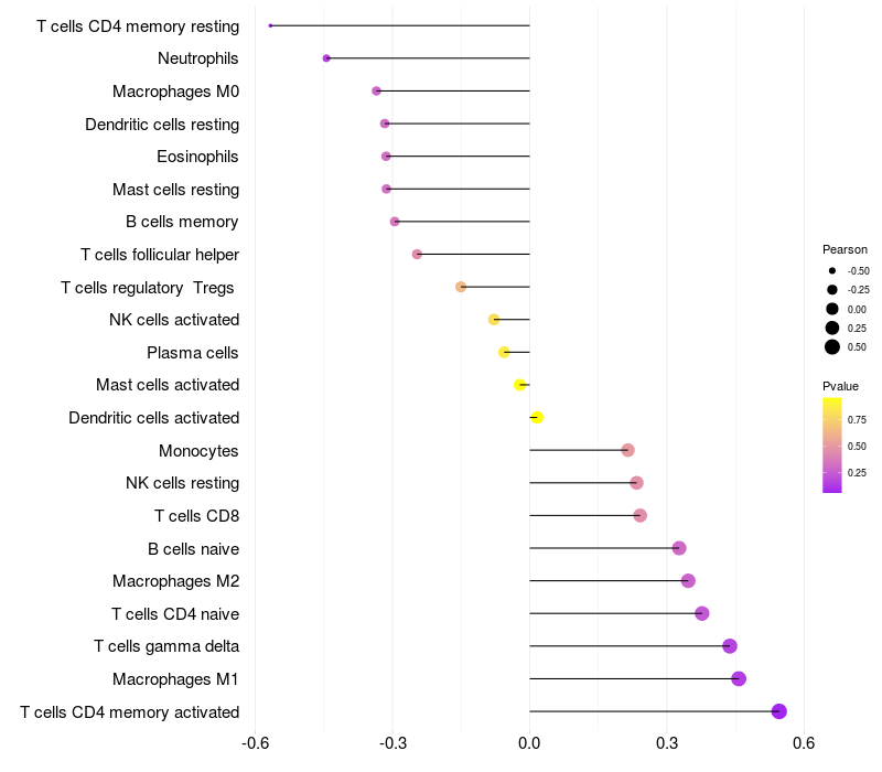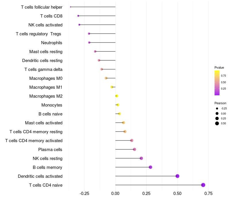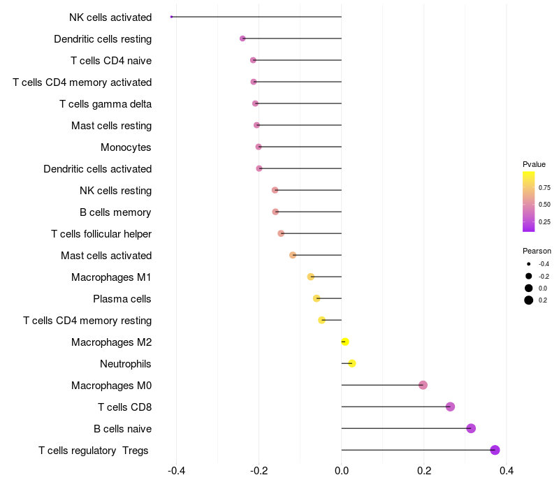 Lollipop of PLCXD2 expression and immune infiltrating cell level correlation result in HPV+ samples