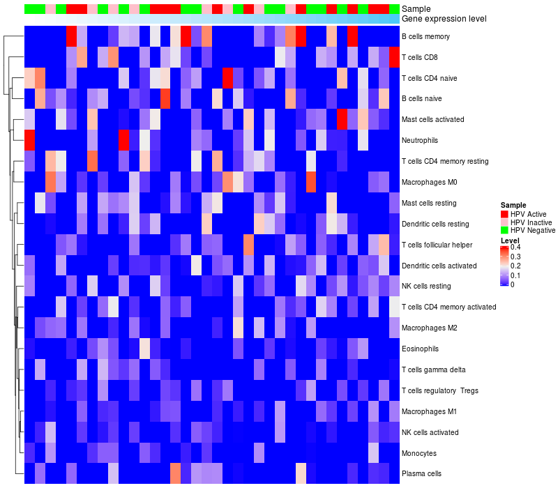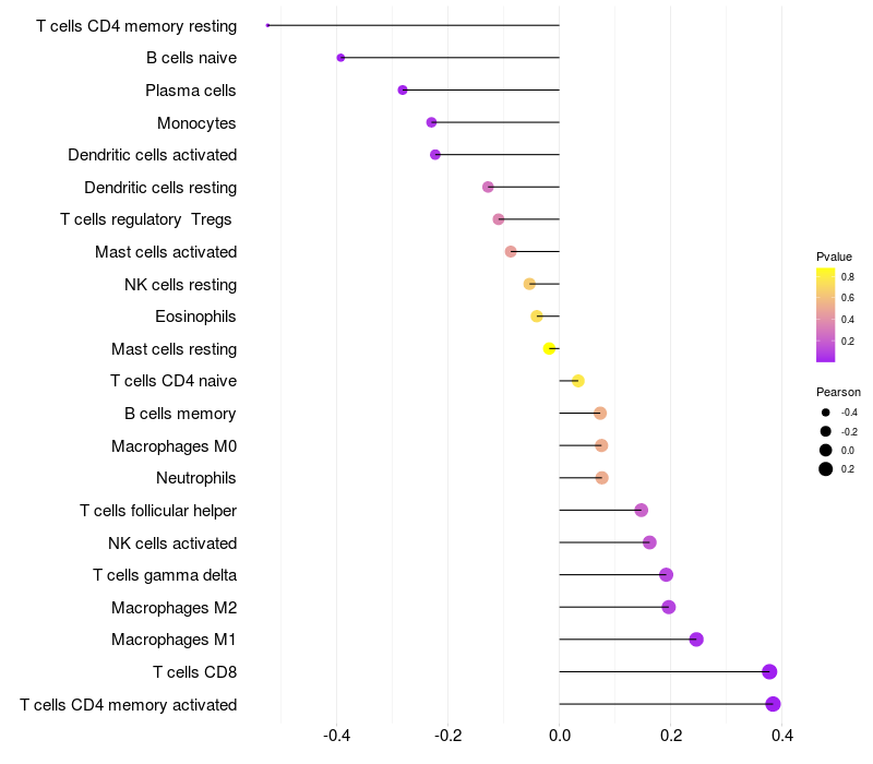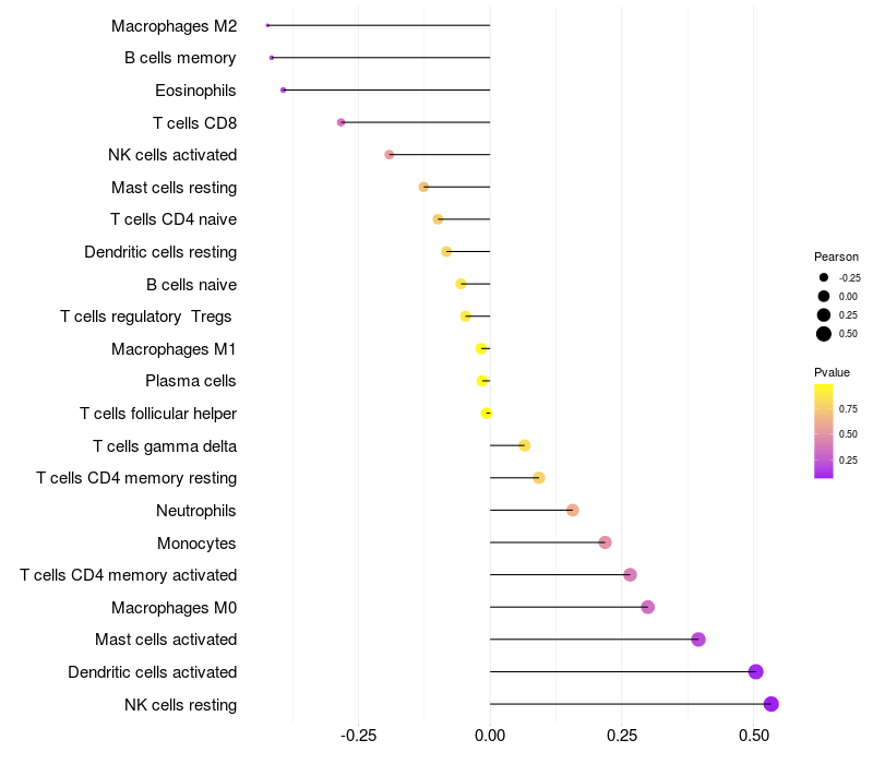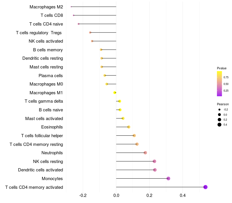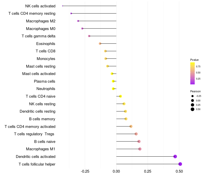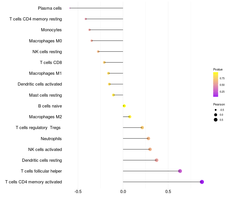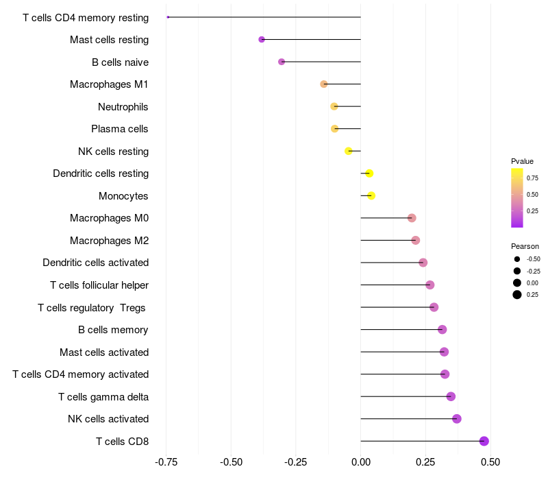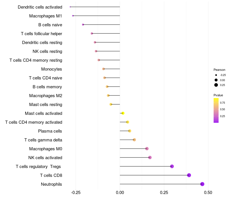 Lollipop of PLEKHF1 expression and immune infiltrating cell level correlation result in HPV+ samples