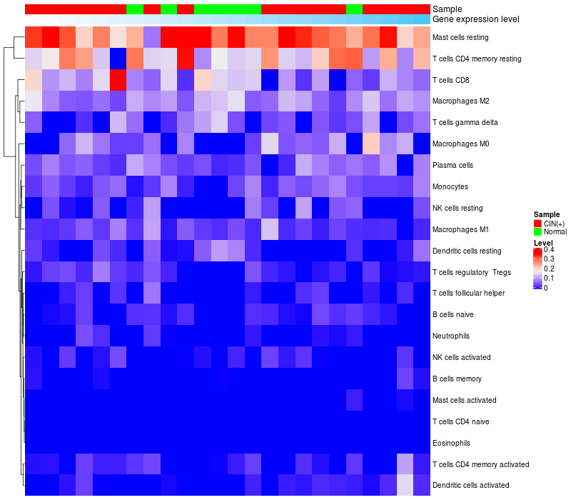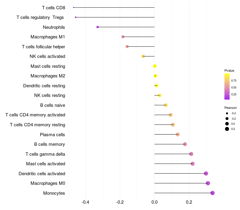 Lollipop of PLGLB2 expression and immune infiltrating cell level correlation result in HPV+ samples