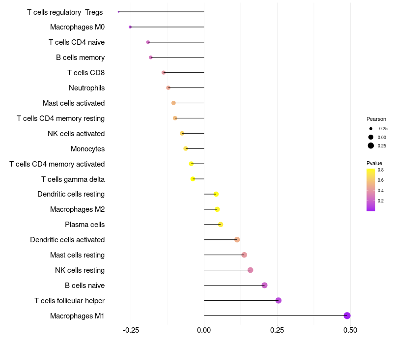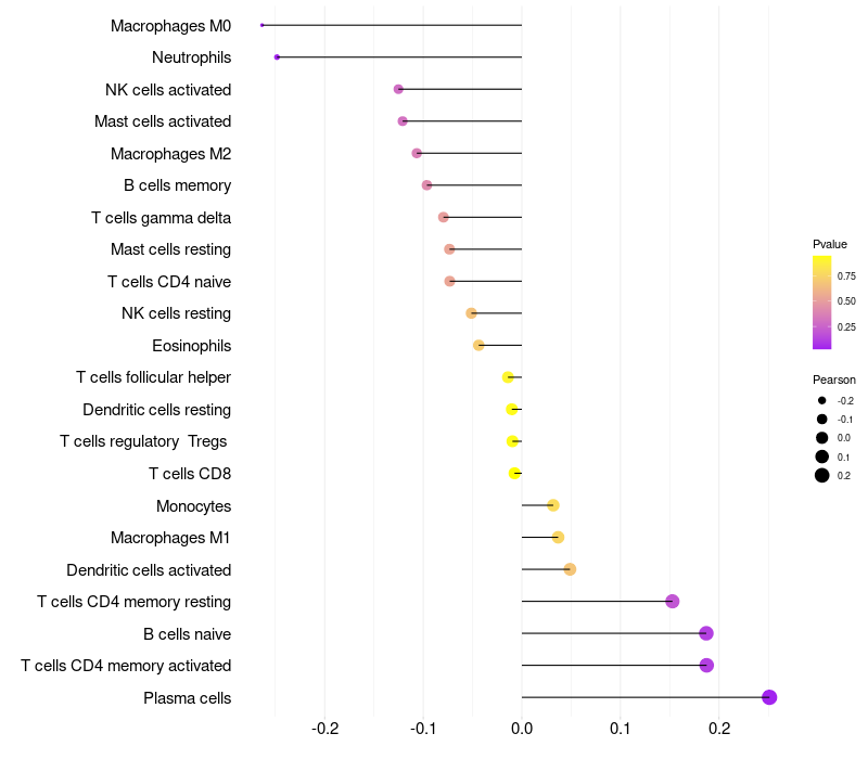 Lollipop of PLSCR4 expression and immune infiltrating cell level correlation result in HPV+ samples