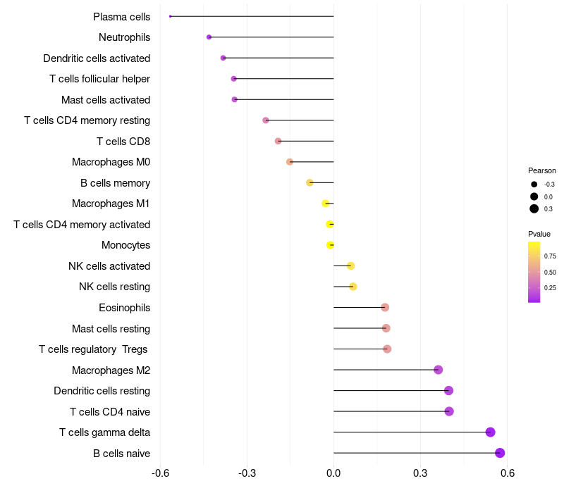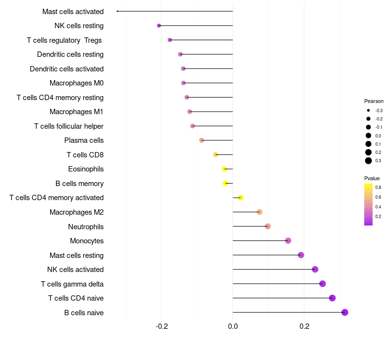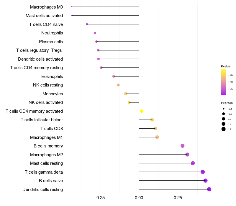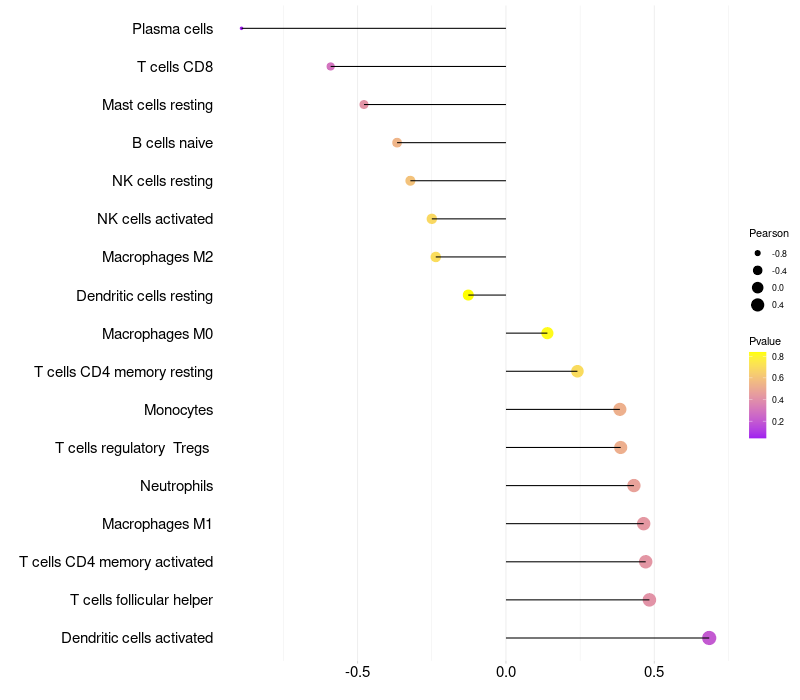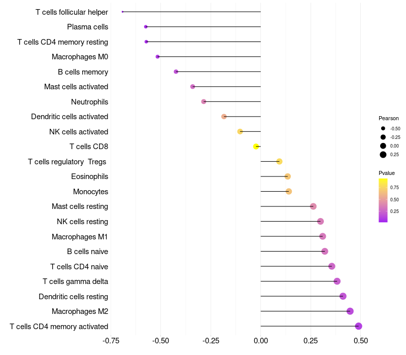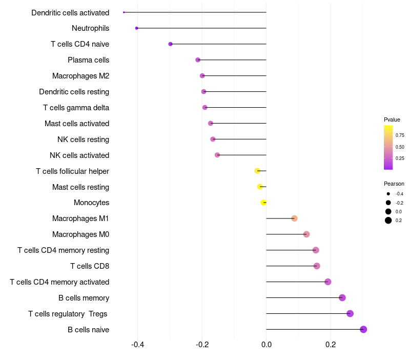 Lollipop of PRDM8 expression and immune infiltrating cell level correlation result in HPV+ samples