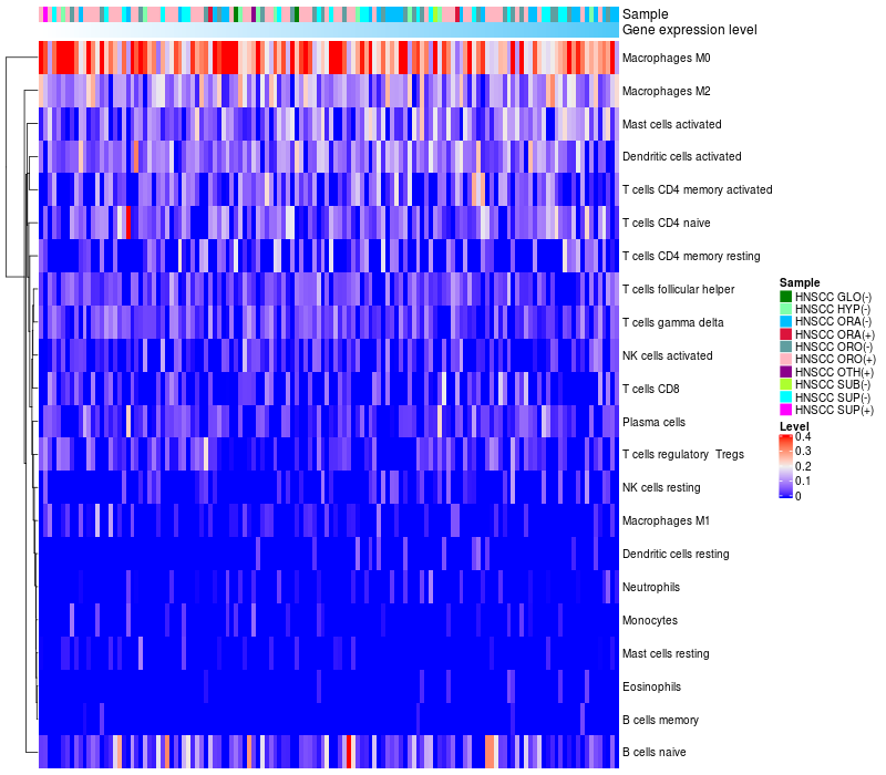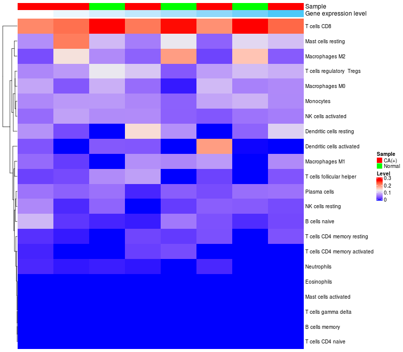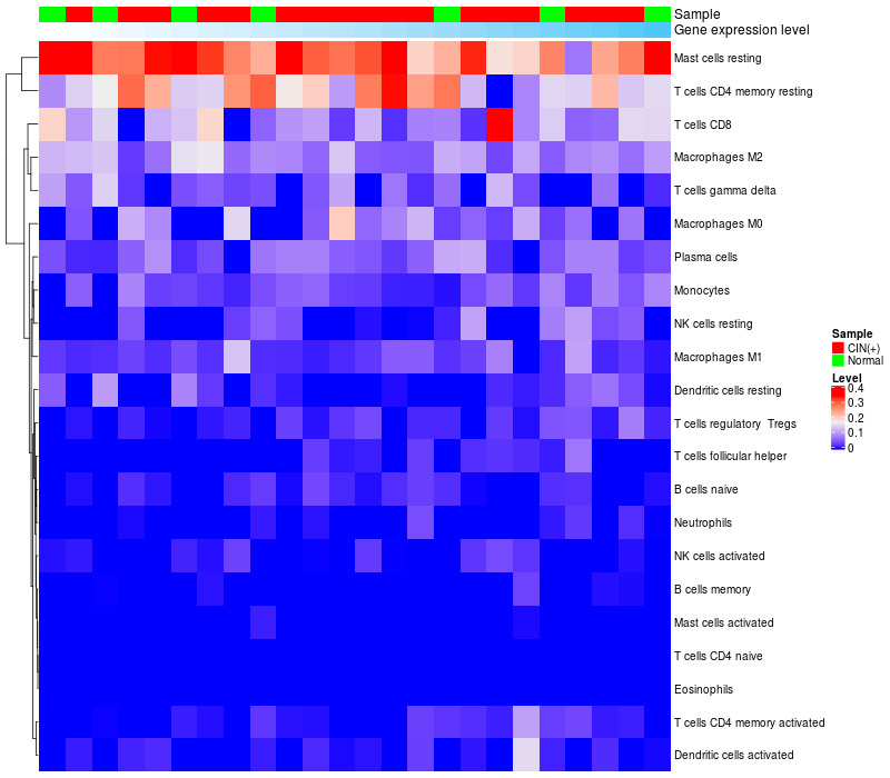 • Left: Heatmap of target gene expression and the level of various types of immune cells (cell type fractions) in all samples based on CIBERSORT method.