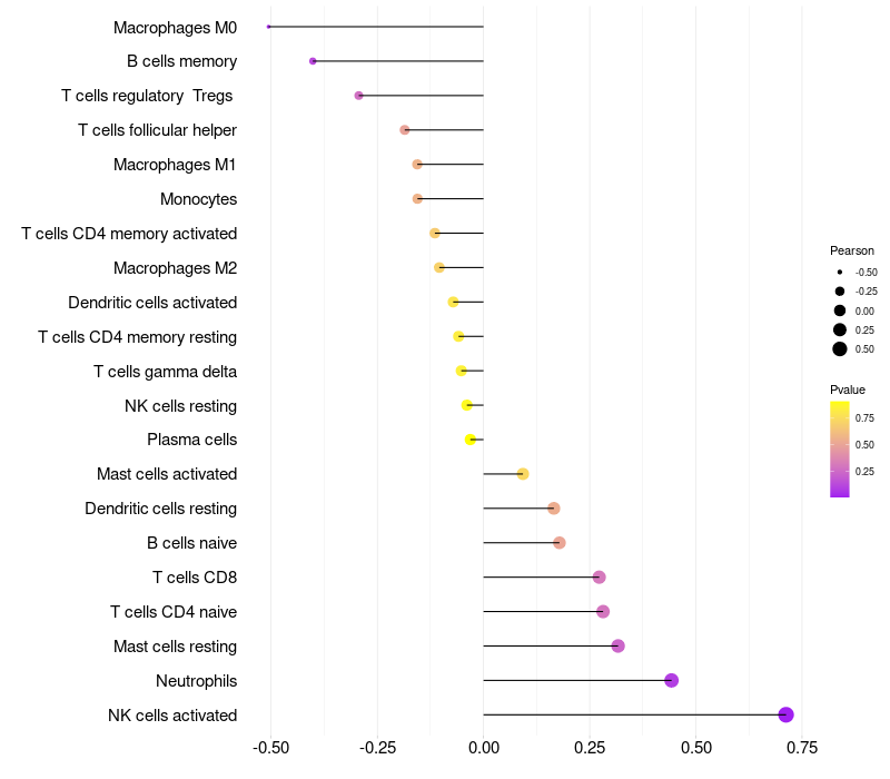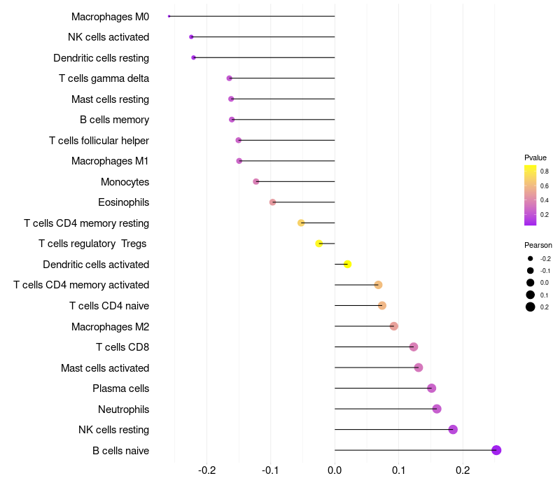 Lollipop of PRSS27 expression and immune infiltrating cell level correlation result in HPV+ samples