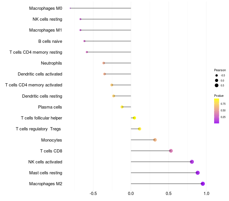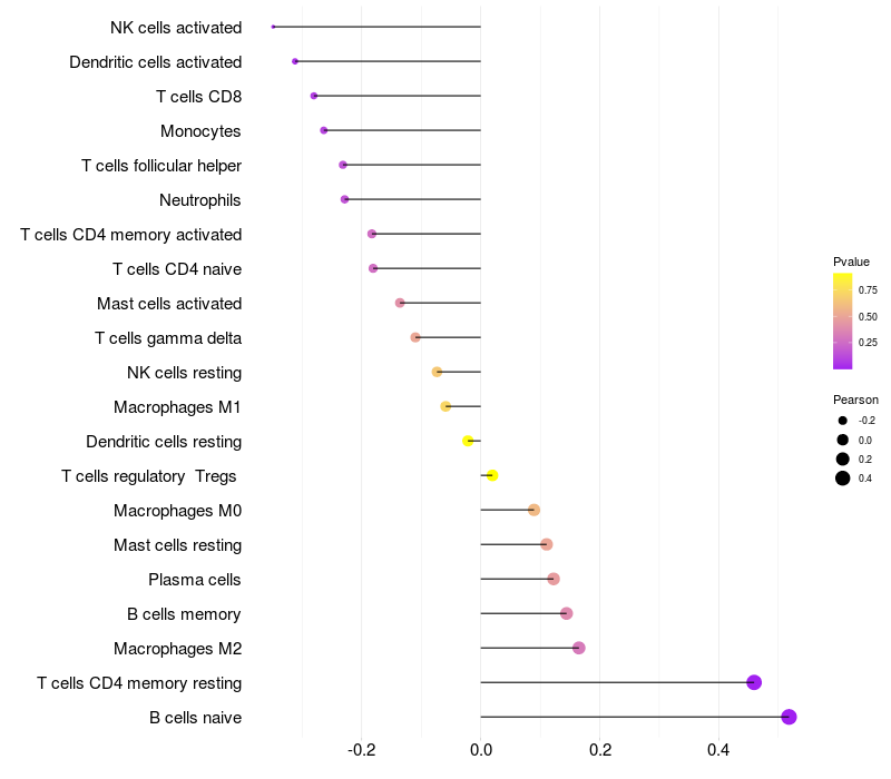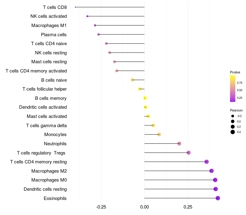 Lollipop of PTGFR expression and immune infiltrating cell level correlation result in HPV+ samples