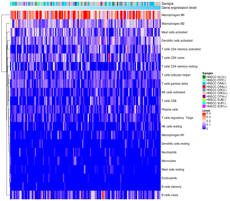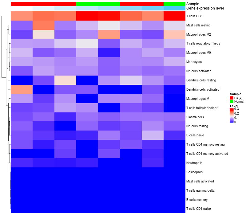 • Left: Heatmap of target gene expression and the level of various types of immune cells (cell type fractions) in all samples based on CIBERSORT method.